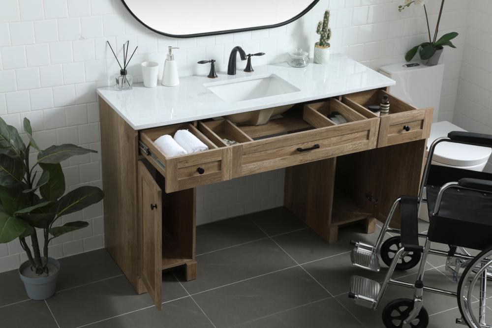 The ADA compliant sink cabinet is tailored for wheelchair access, providing a seamless and user-friendly experience for all.