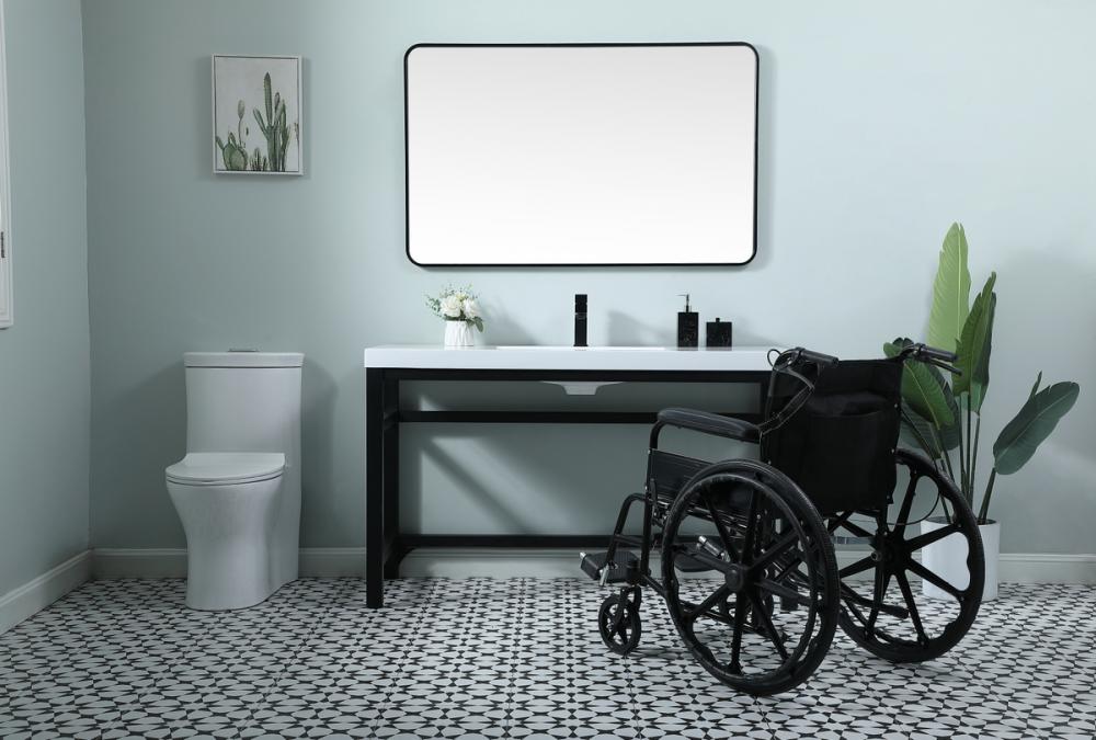 The open design beneath the vanity provides ample storage space for bathroom essentials, making it easy to access items while sitting in a wheelchair.
