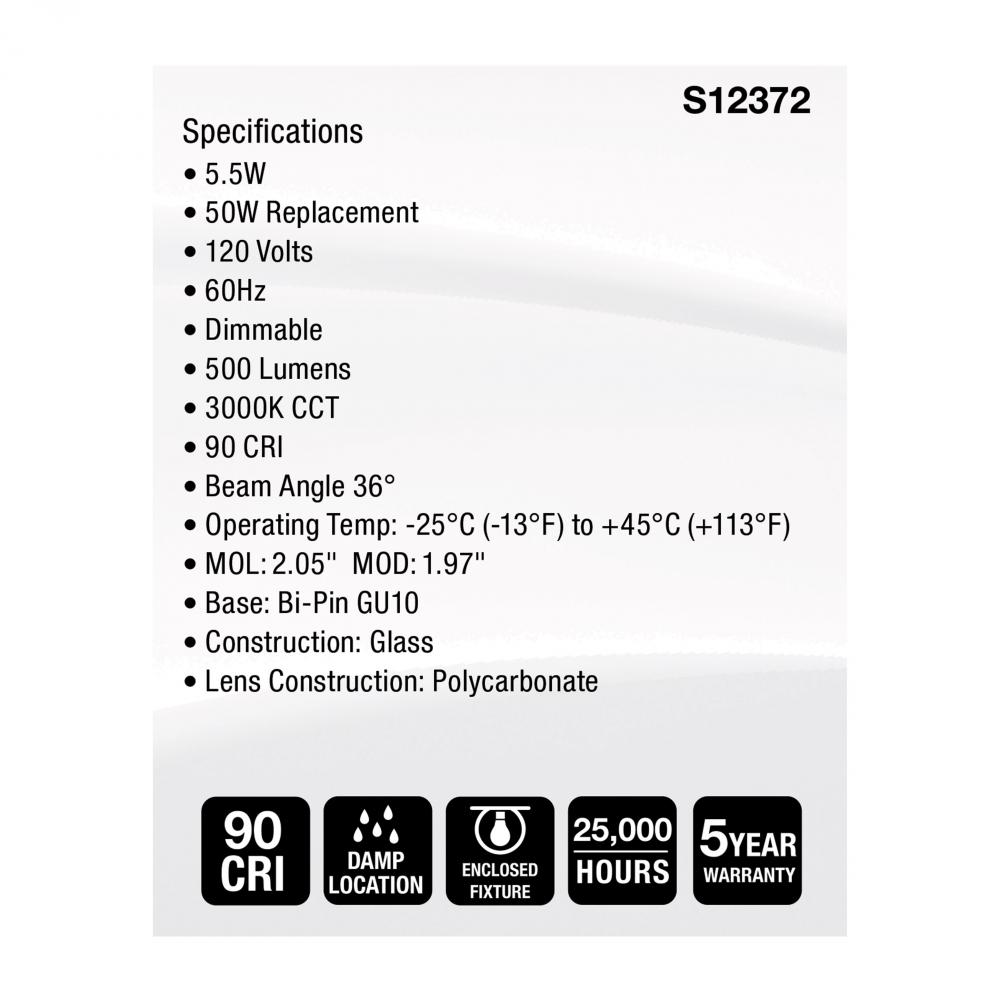 SATCO S12372 MR16 lamps provide high color accuracy with a 90 CRI and are dimmable for customizable lighting. These lamps are also damp location rated, and suitable for use in enclosed fixtures. Perfect for a variety of residential and commercial applicati
