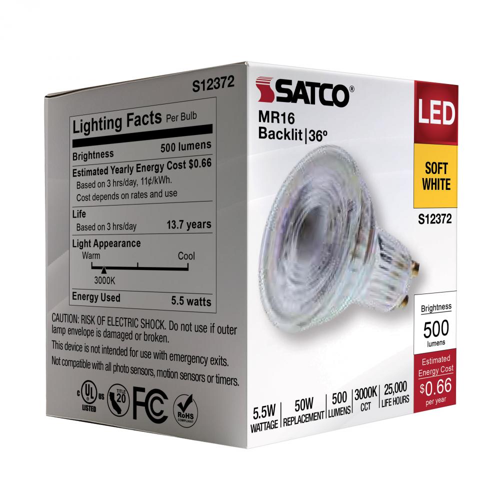 5.5 Watt MR16 LED Floodlight; 3000K CCT; GU10 Base; 120 Volt