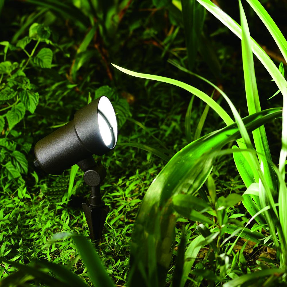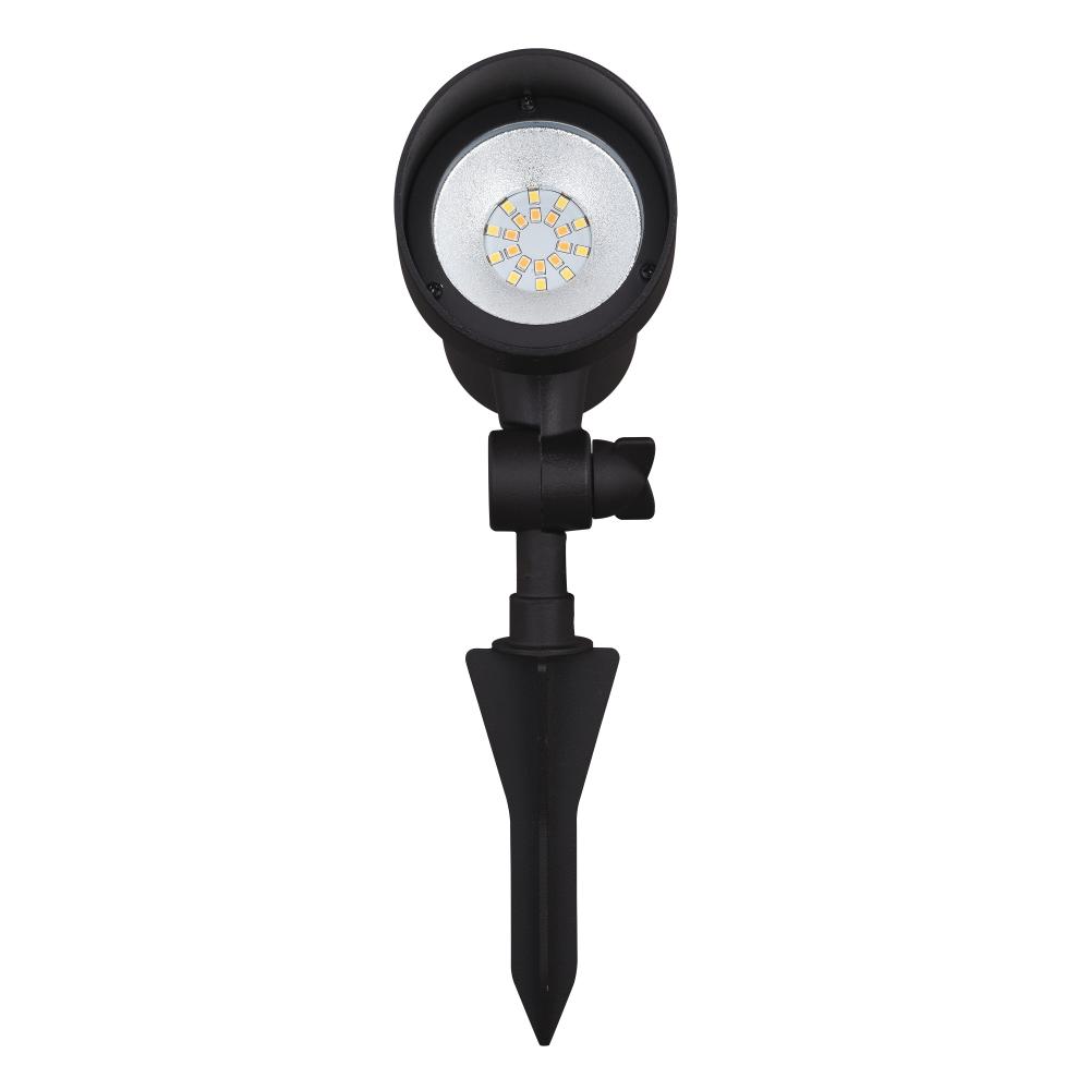 This contemporary low voltage landscape flood light with integrated LED is the perfect outdoor lighting solution. It offers functionality, energy savings, and security for your outdoor spaces. Rotate the single black light head vertically up or down to direct the light precisely where you need it. Bright 550 lumens of output plus three selectable color temperatures - 3000K warm white, 4000K bright white, 5000K daylight - allow you to choose the quality of brightness. Connect this stake spot light with other landscape lighting products to customize and highlight your outdoor spaces. Ground stake and connector cable included. Low voltage transformer required (sold separately).