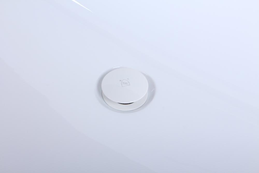 The all-white drain trim seamlessly blends with the bathtub's design, maintaining its modern look while providing efficient drainage through the flexible 35 inch long drain pipe.