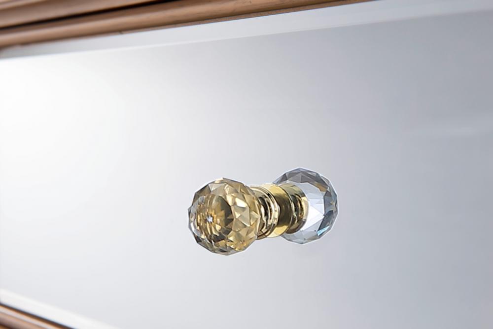 With its crisp, classy lines, crystal knobs and incised carved feet