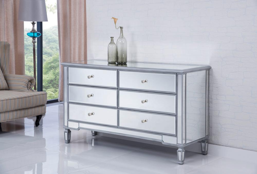 With its crisp and classy lines, crystal knobs and incised carved feet, this dazzling dresser measures w60”xd20”xh34”.
