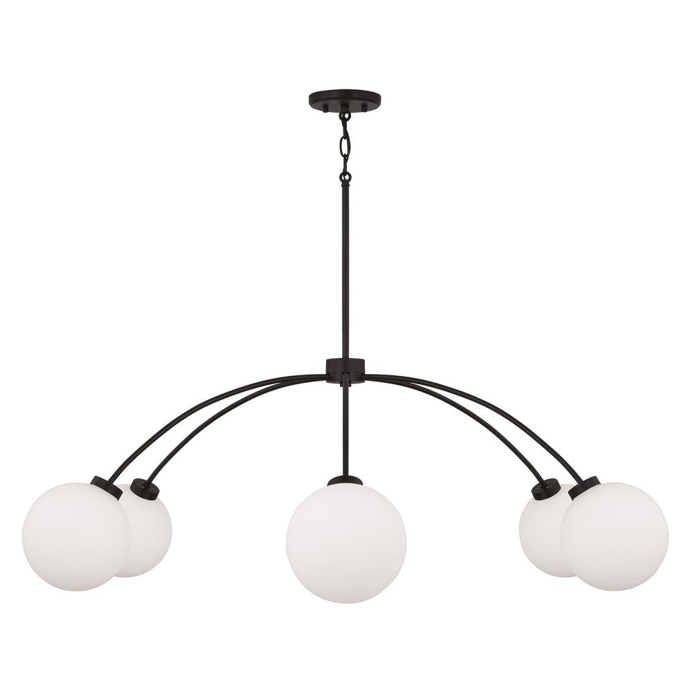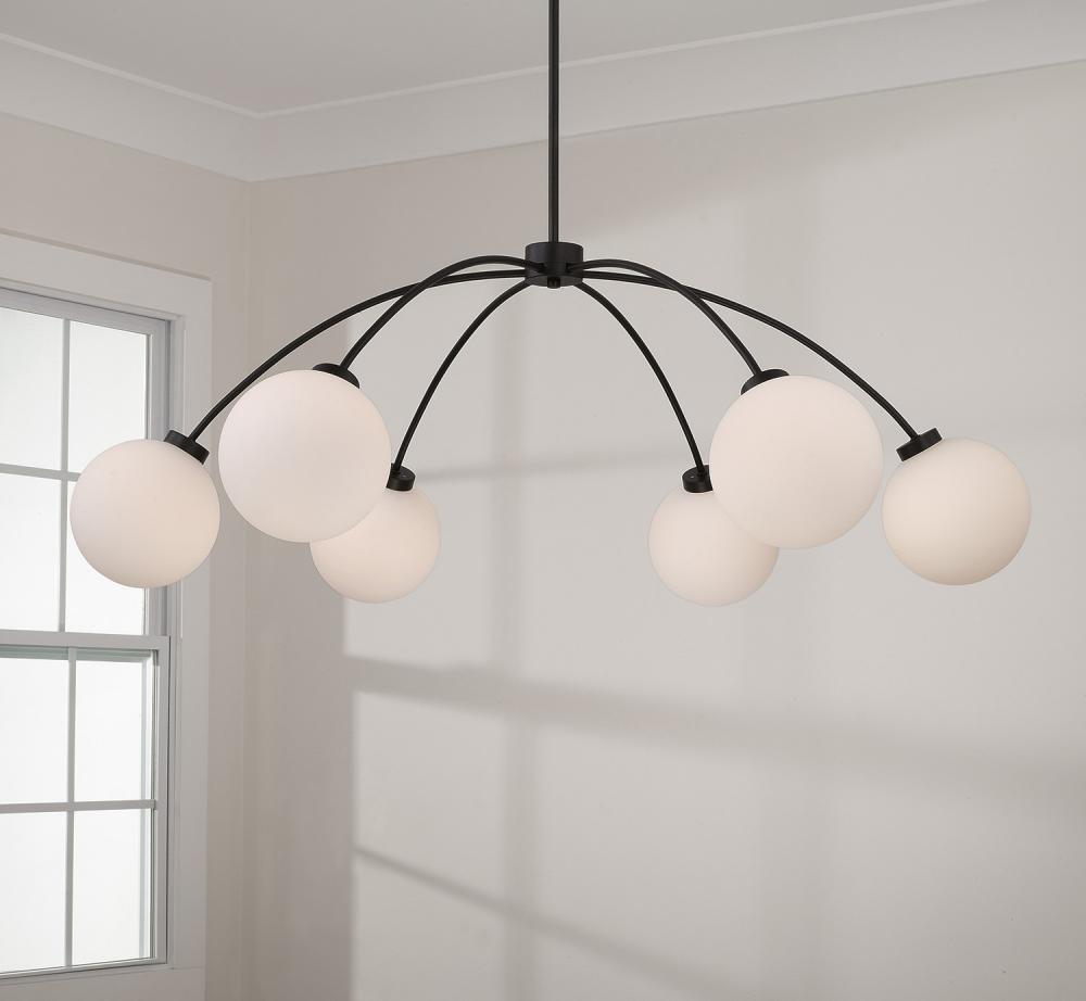 Bring modern curves and high contrast to any space with the Amos Large Chandelier. The Soft White glass globes almost seem to float at the bottom of the curved arms, while the Black Iron finish creates subtle texture for added visual appeal.