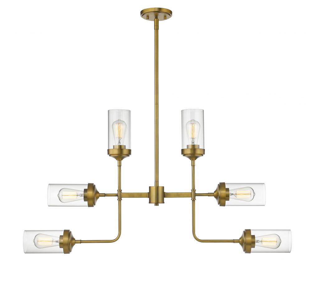 Make a half-dozen sleek clear glass cylinder shades work magic in a dining or living space. With a charming industrial-themed steel body finished in warm foundry brass, this six-light pendant delivers a fun contemporary spin on a hardware-inspired d?cor element.