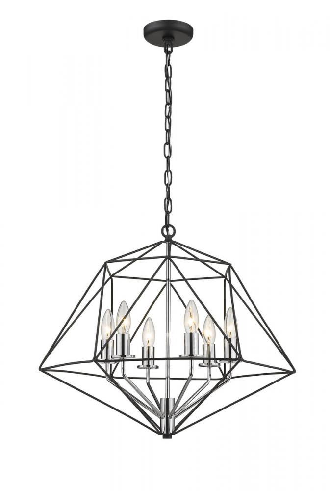 Fully energizing in its sleek geometric silhouette, this six-light chandelier delivers sophistication and contemporary verve in a modern living or dining space. Follow the angles of an open cage-like frame fashioned from two-tone finish metal in Matte Black and Chrome, and a dynamic architectural theme that offers mesmerizing effects.