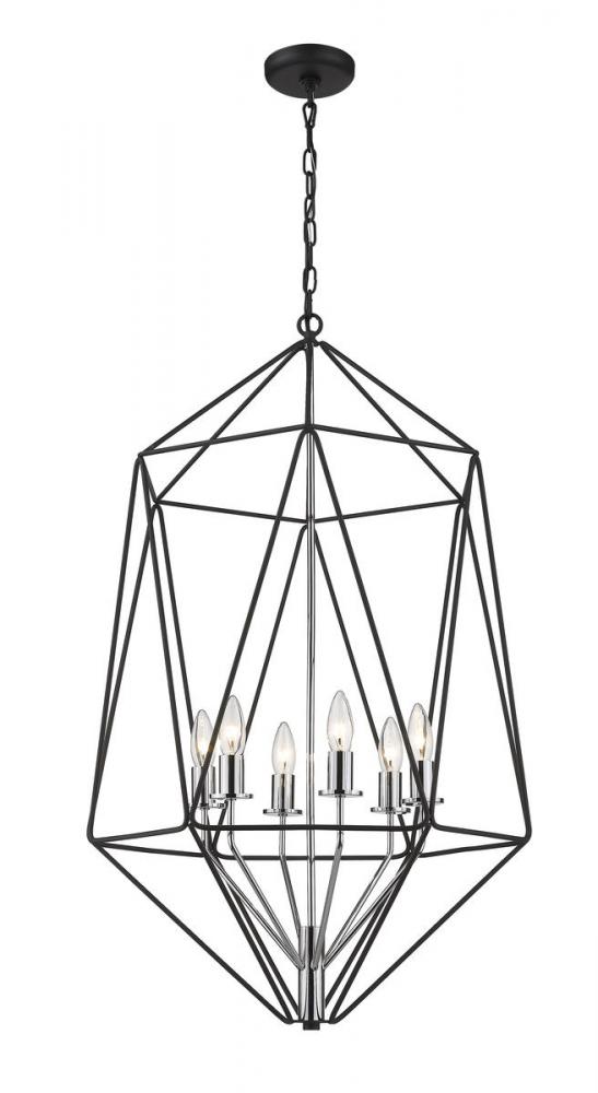 Fully energizing in its sleek geometric silhouette, this six-light chandelier delivers sophistication and contemporary verve in a modern living or dining space. Follow the angles of an open cage-like frame fashioned from two-tone finish metal in Matte Black and Chrome, and a busy yet symmetrical outline.