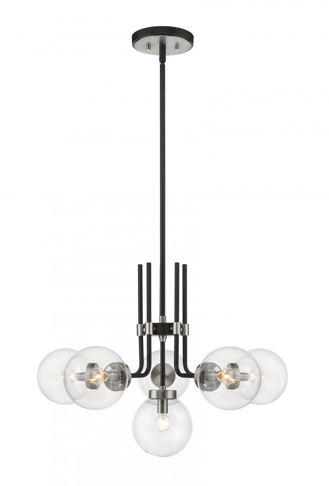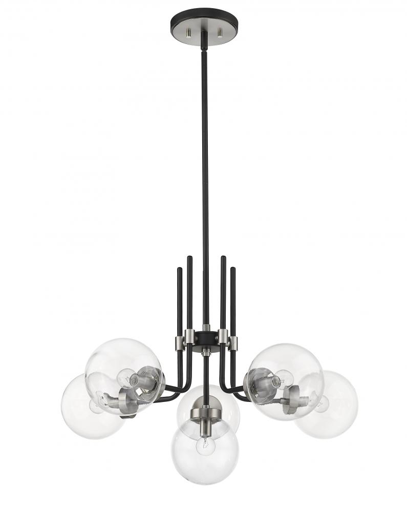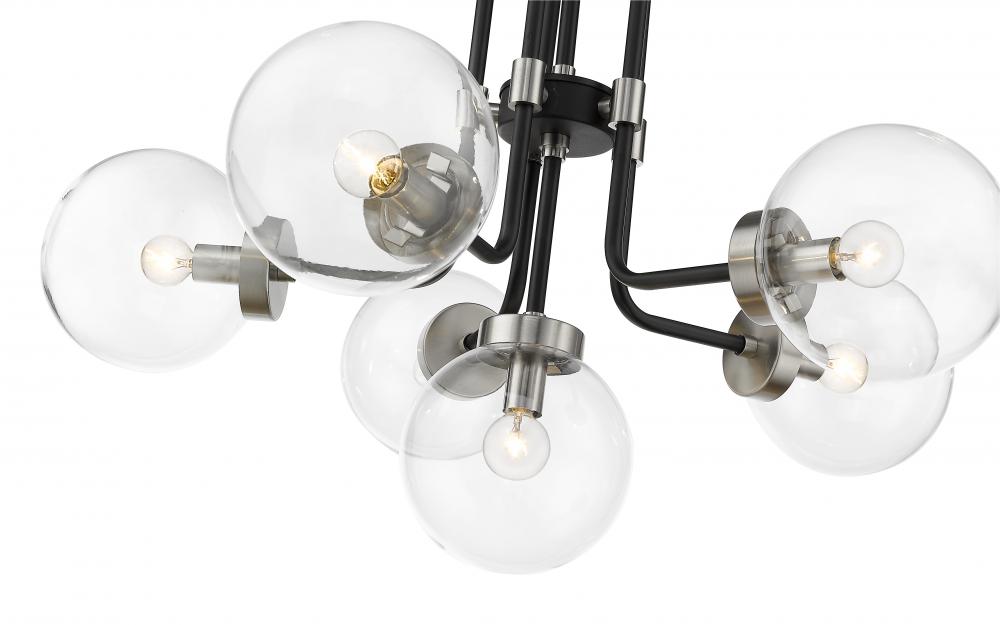 This clean, crisp six-light chandelier adds a magnificent aura to your home. Its fashioned with a matte black and brushed nickel finish and clear glass shades for the brilliant radiance youre looking for. This beauty will uplift any space in the home, whether its the dining room, foyer, hallway, or kitchen.