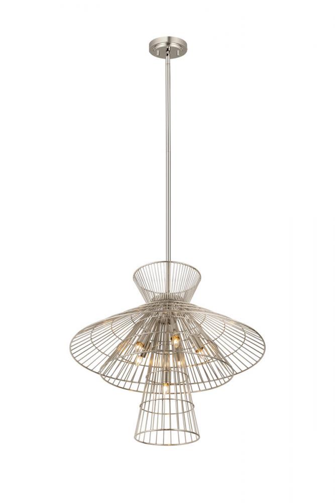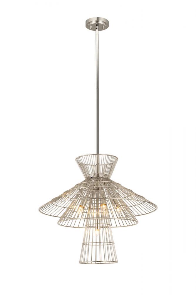 Offer up an energetic look while choosing lighting in a custom space, adding the Alito six-light pendant to steal the show. Gleaming polished nickel finish iron crafts a tiered geometric arrangement of wired pieces and matching down rod and canopy. This striking fixture reflects a blend of industrial and modern styling.