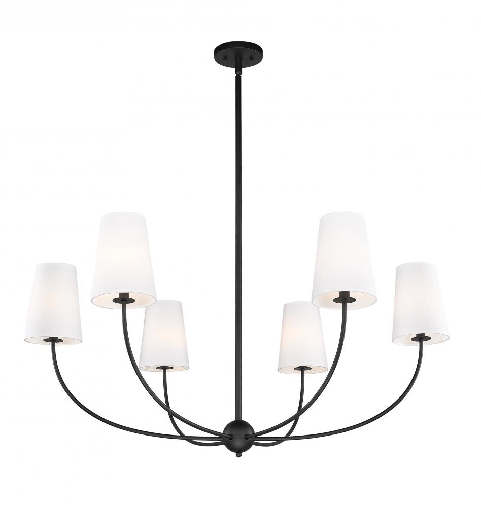 Crisp in style and contrast, the Shannon six-light chandelier becomes a focal point in any modern space. Embrace the cool aesthetic of a matte black finish steel frame with subtly curved arms and lights capped with classic white fabric shades reflecting traditional style. Infuse ambient lighting over a dining ensemble, in an entryway, or in a main living area with this tasteful chandelier.