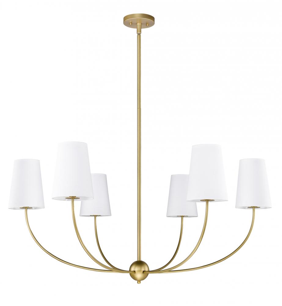 The Shannon six-light chandelier becomes a focal point in any modern space with its easy yet sophisticated aesthetic. Embrace the beauty of a rubbed brass finish steel frame with subtly curved arms and lights capped with classic white fabric shades reflecting traditional style. Infuse ambient lighting over a dining ensemble, in an entryway, or in a main living area with this tasteful chandelier.