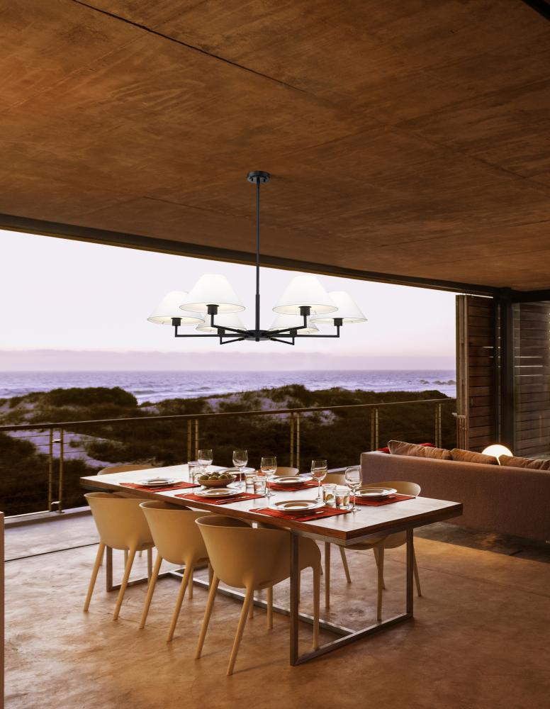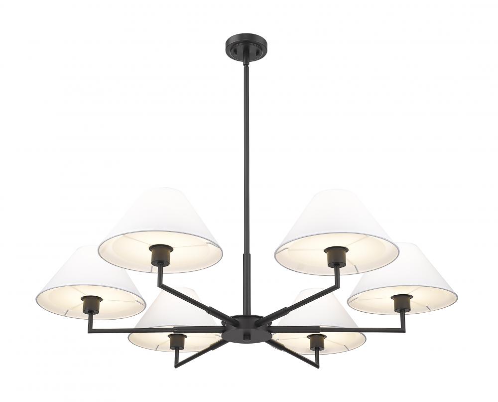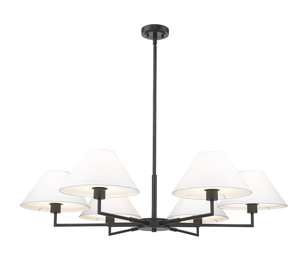 Inject a little modern simplicity into surrounding decor with a stylish six-light chandelier. In a cool matte black finish, this delightful fixture is a flexible option everywhere from your dining room to a master suite, casting warm, bright illumination while instilling radiant elegance. Its six lights are complete with empire shades for a classic touch updated with white linen for light, bright ambiance.