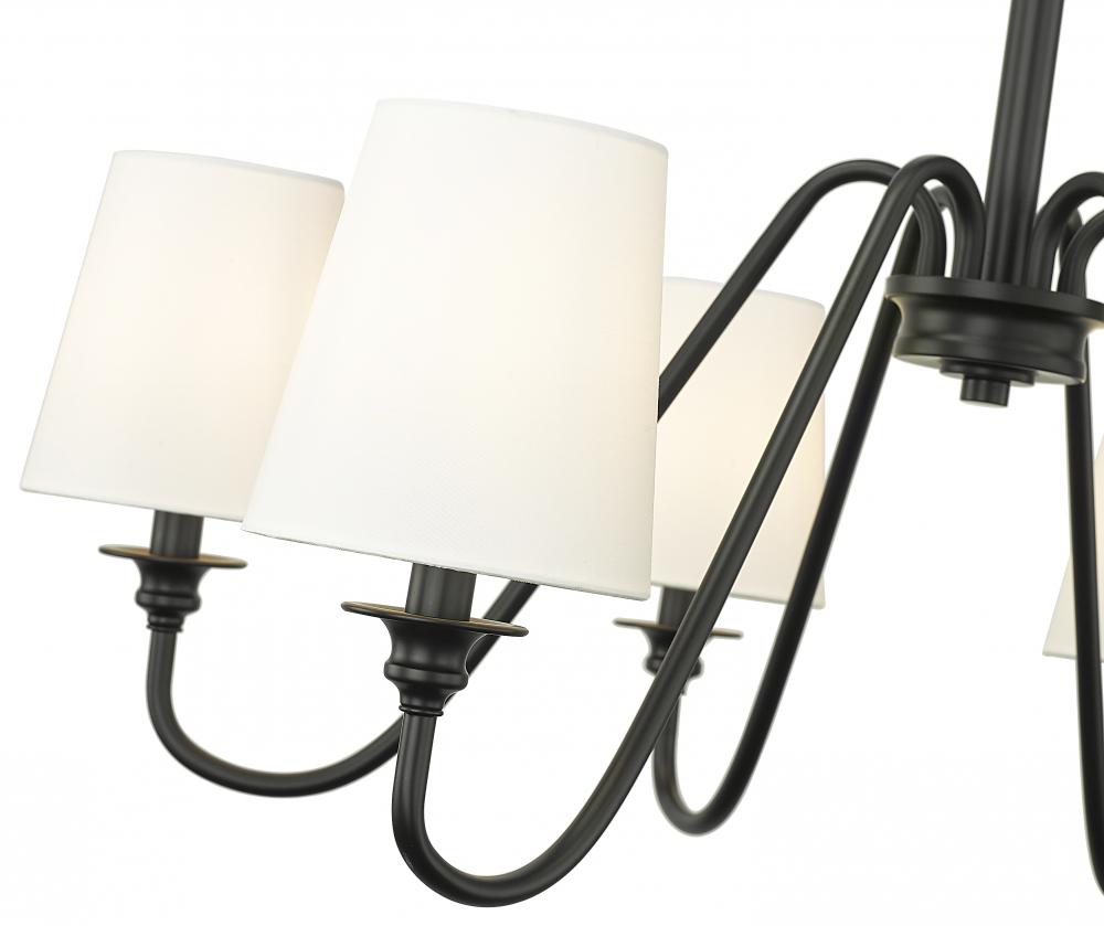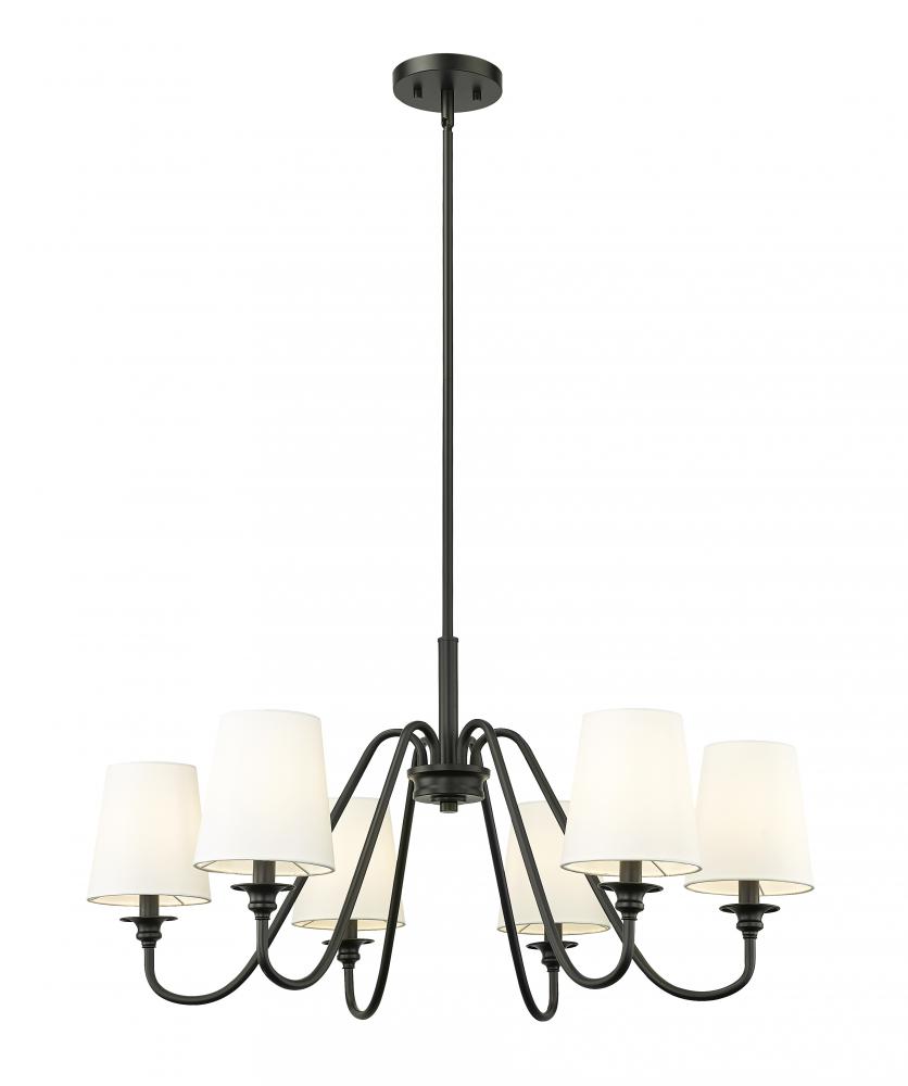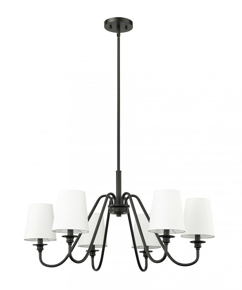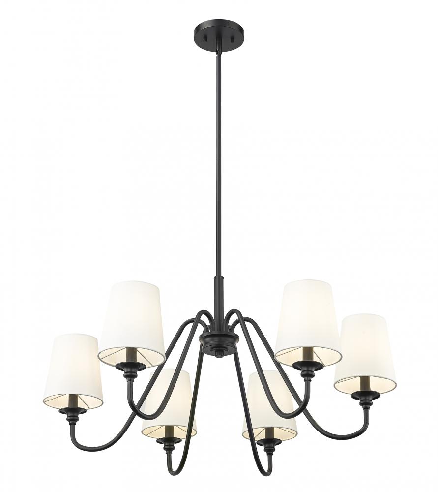 Simple, sweeping lines bring airy modernism to a chic six-light chandelier. Perfect for lighting a large foyer or dining room, it pairs a deep matte black finish with opaque white shades, offering bright but diffused illumination that sets a refined ambiance.