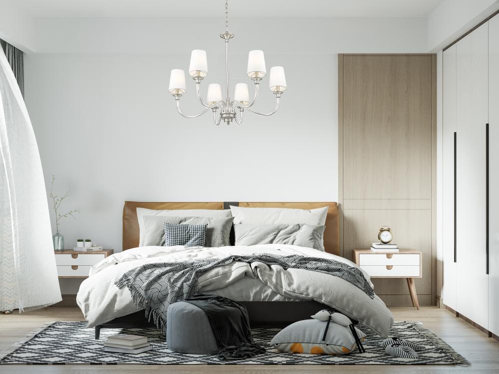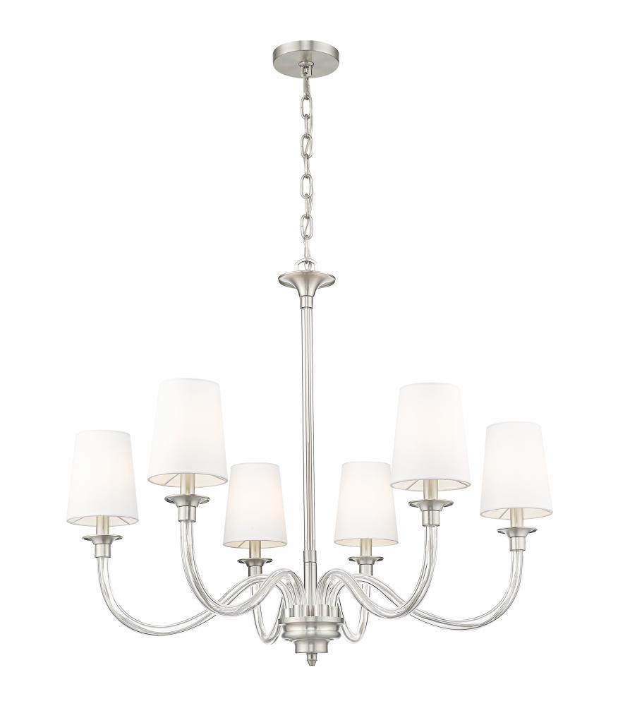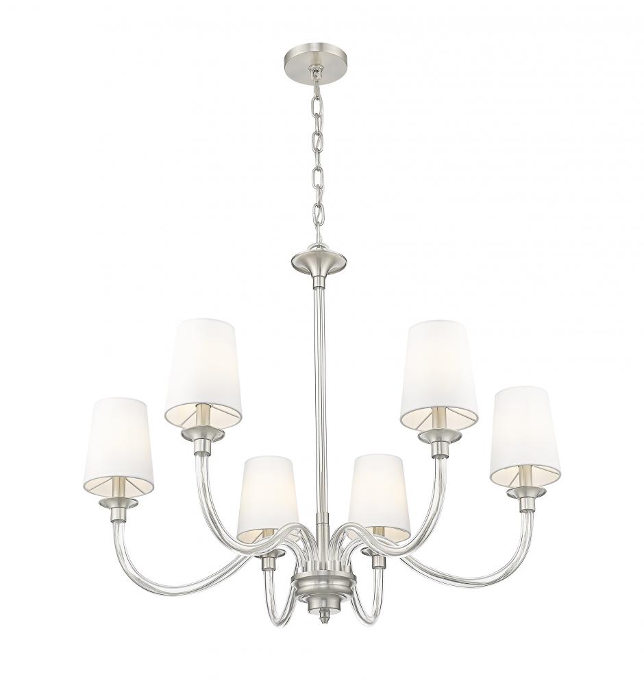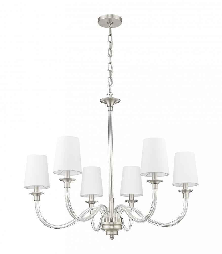 Pre-war decorative elegance infuses this modern six-light chandelier. Slender glass arms pair with a steel frame and brushed nickel finish, ensuring a rich, refined look and feel. The fixture is complete with tapering white fabric shades, offering the perfect ambiance for every occasion.