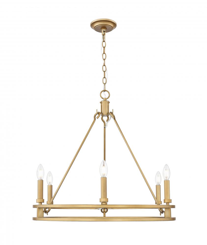 Bringing just the right touch of golden restraint, this six-light chandelier is perfect for rooms that call for warmth without excess. Its signature brass finish softens the clean, open structure, offering balanced illumination that adapts to any setting. Whether suspended over a dining table or grounding a relaxed loft space, it blends architectural simplicity with inviting glow.