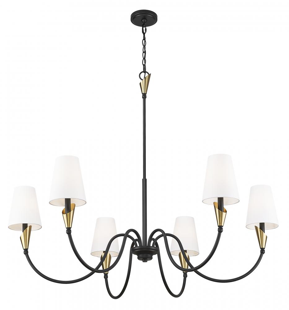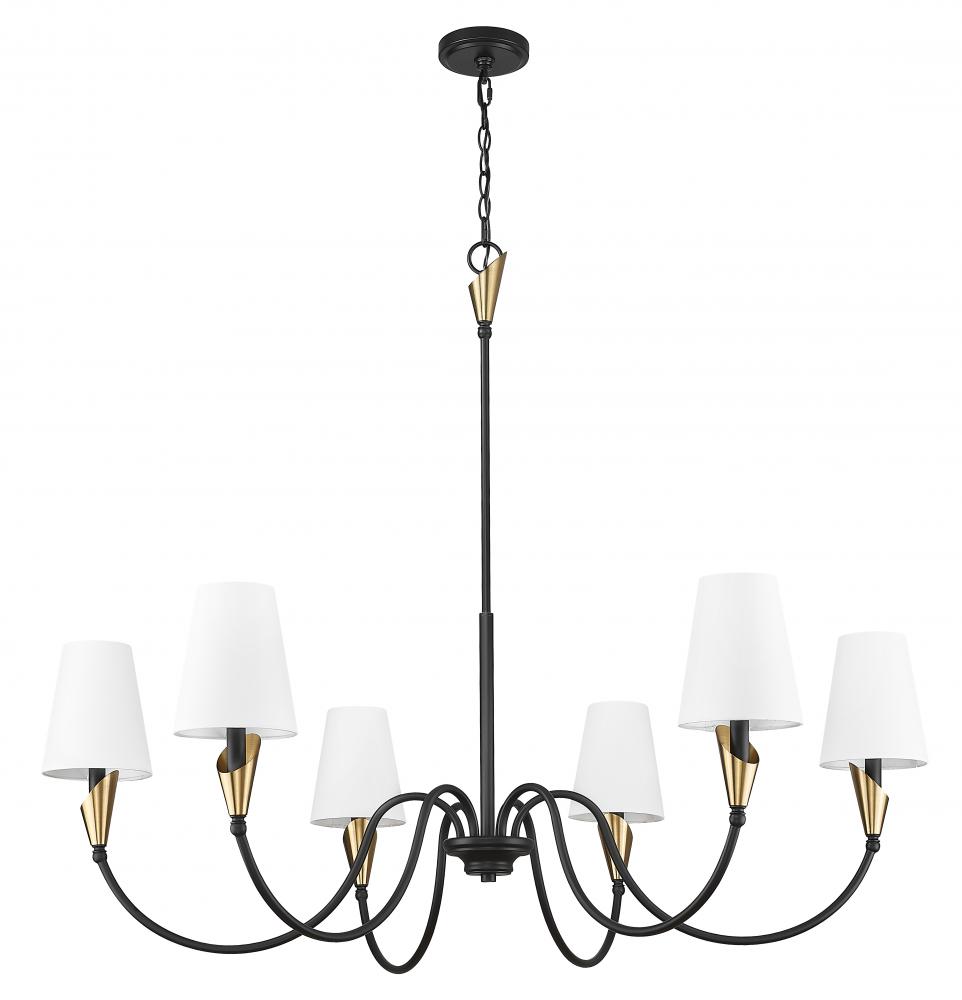 Chic and structured with a sense of movement, this chandelier balances contrast and curve with effortless style. Matte black arms stretch upward in fluid arcs, accented with gold touches and softened by white linen shades. It?s a modern classic that suits spaces from bold to neutral.