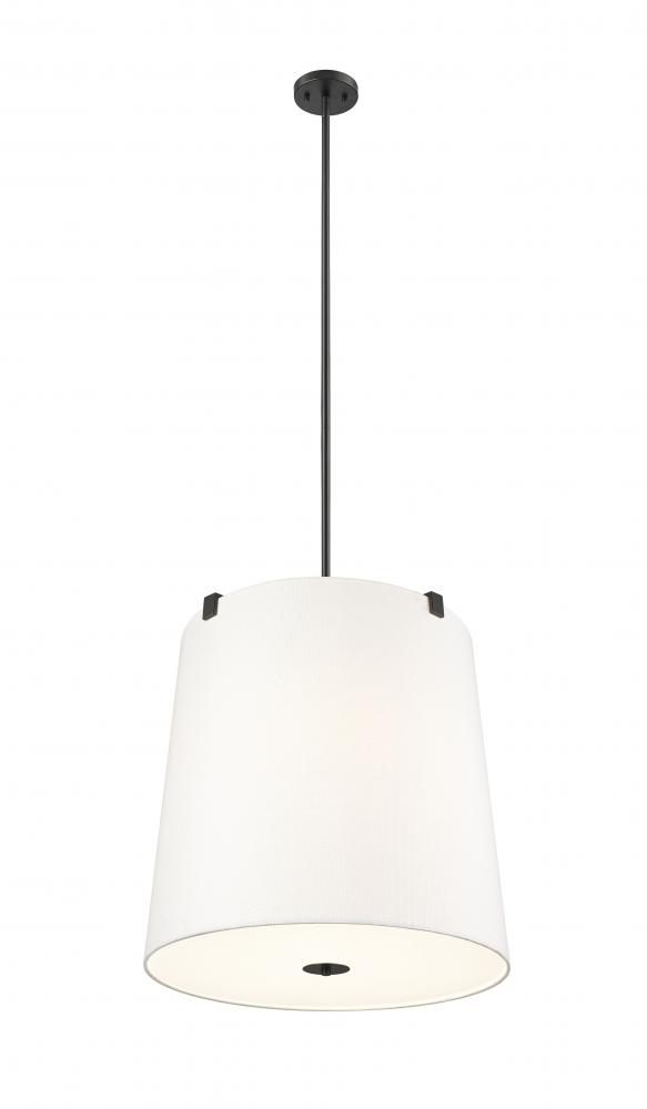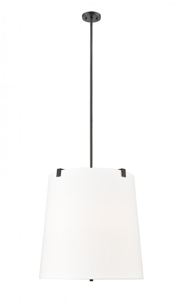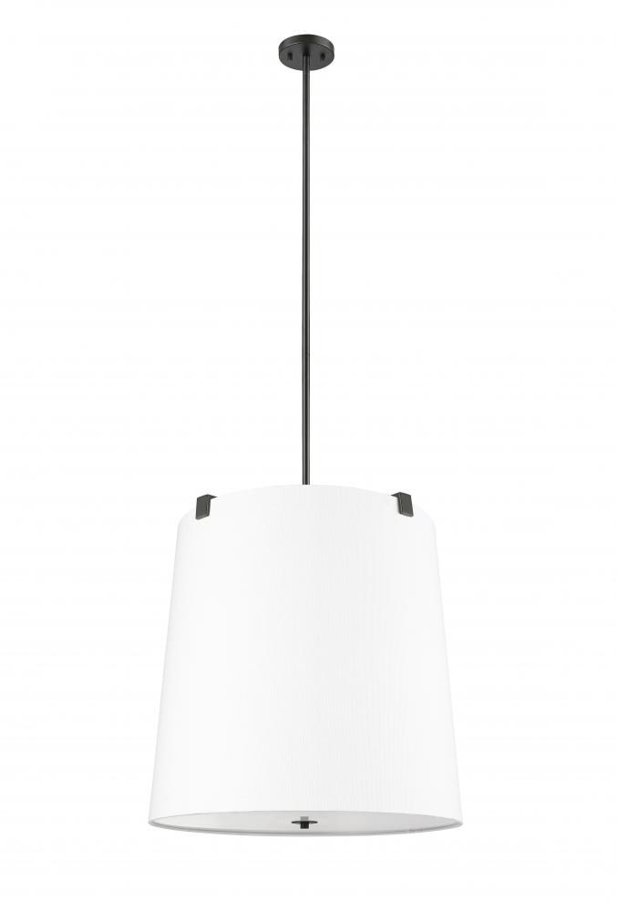 This tastefully styled six-light pendant reflects a tribute to conventional yet chic traditional aesthetic. Bold matte black finish steel framing with clips attaches to a white linen fabric shade, offering a low-profile vibe, as candelabra lights diffuse illumination beautifully. This fixture is dimmable, creating mood lighting and efficient functionality.