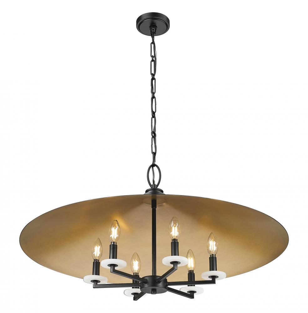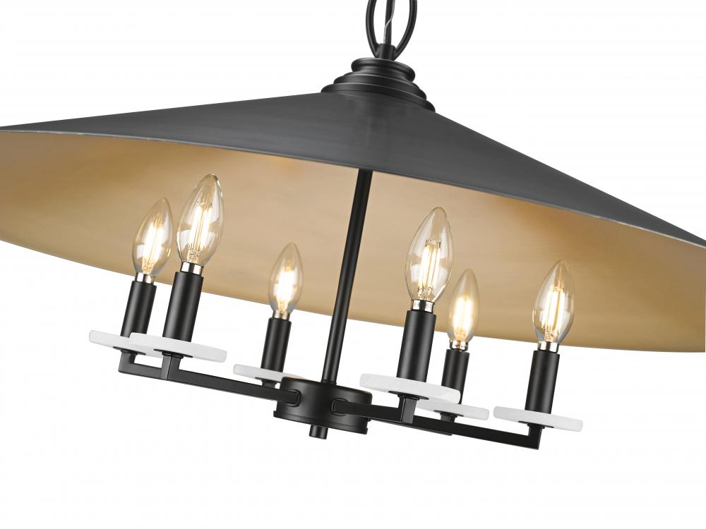 Bring cozy warmth and elegance to your living or dining room with this industrial six-light pendant. A matte black finish frame and conical shade are paired with a gold finish shade interior, casting inviting illumination over a living or dining space. The fixture includes alabaster bobeches and comes with three finishes of candle sleeve for the perfect look in every season.