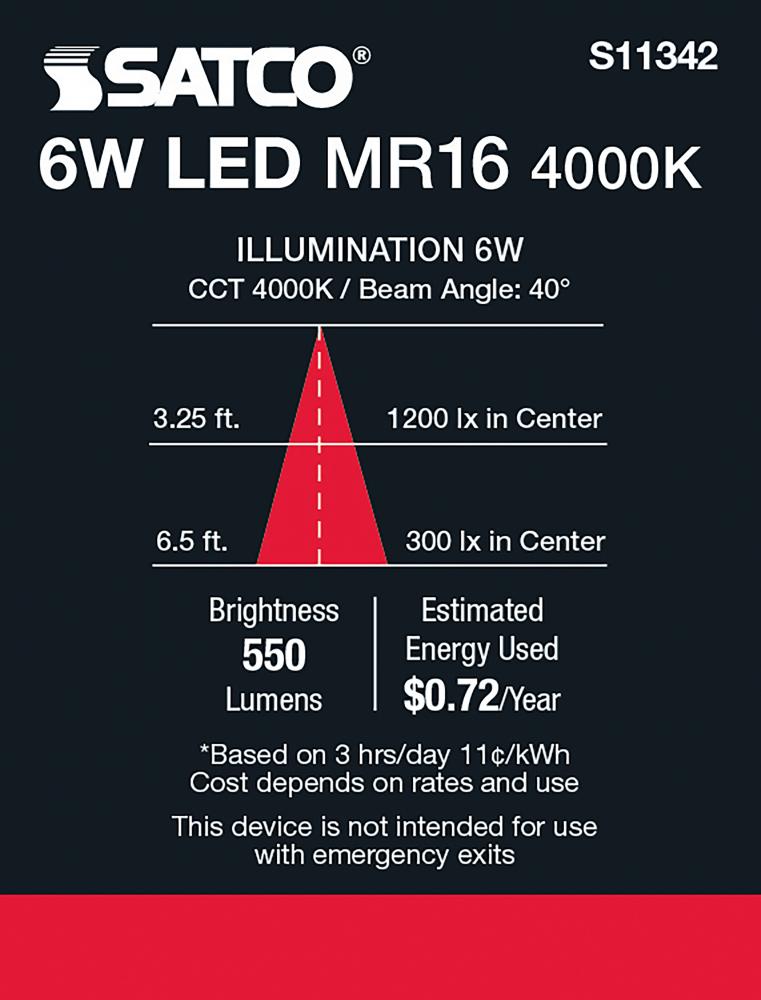 6 Watt; MR16 LED; 4000K; GU5.3 base; 40 deg. Beam Angle; 24 Volt