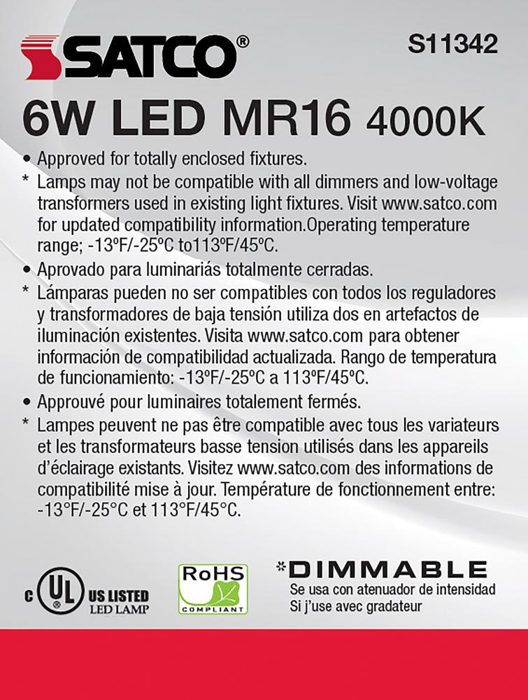 Satco's S11342 24-volt, 4000K MR16 LED lamp serves as a direct replacement for halogen lamps. These are dimmable and suitable for use with indoor damp locations. The MR16 can be used with downlight fixtures, accent lighting, and pendant lighting.