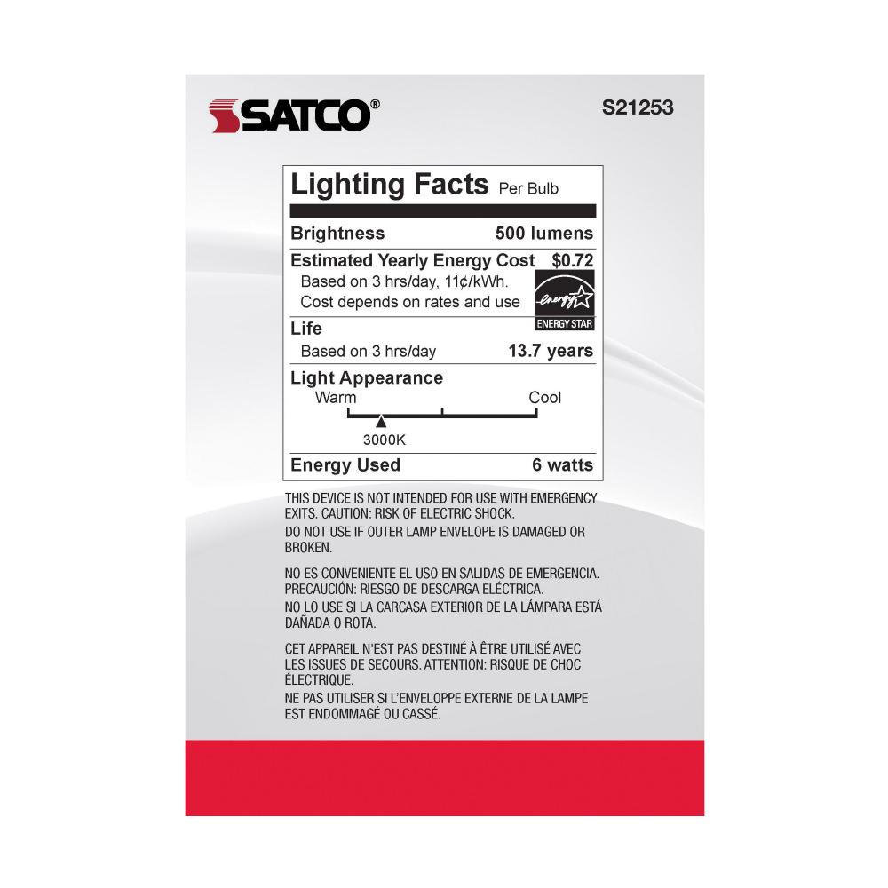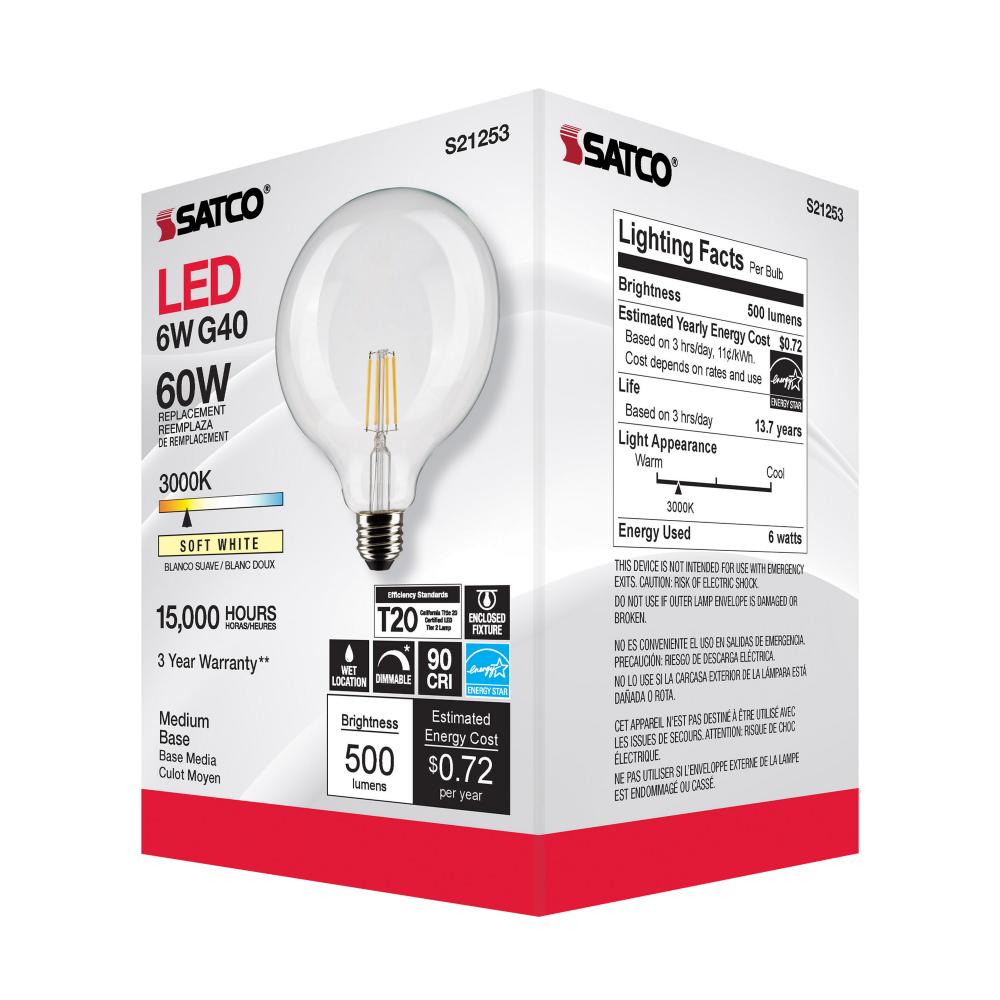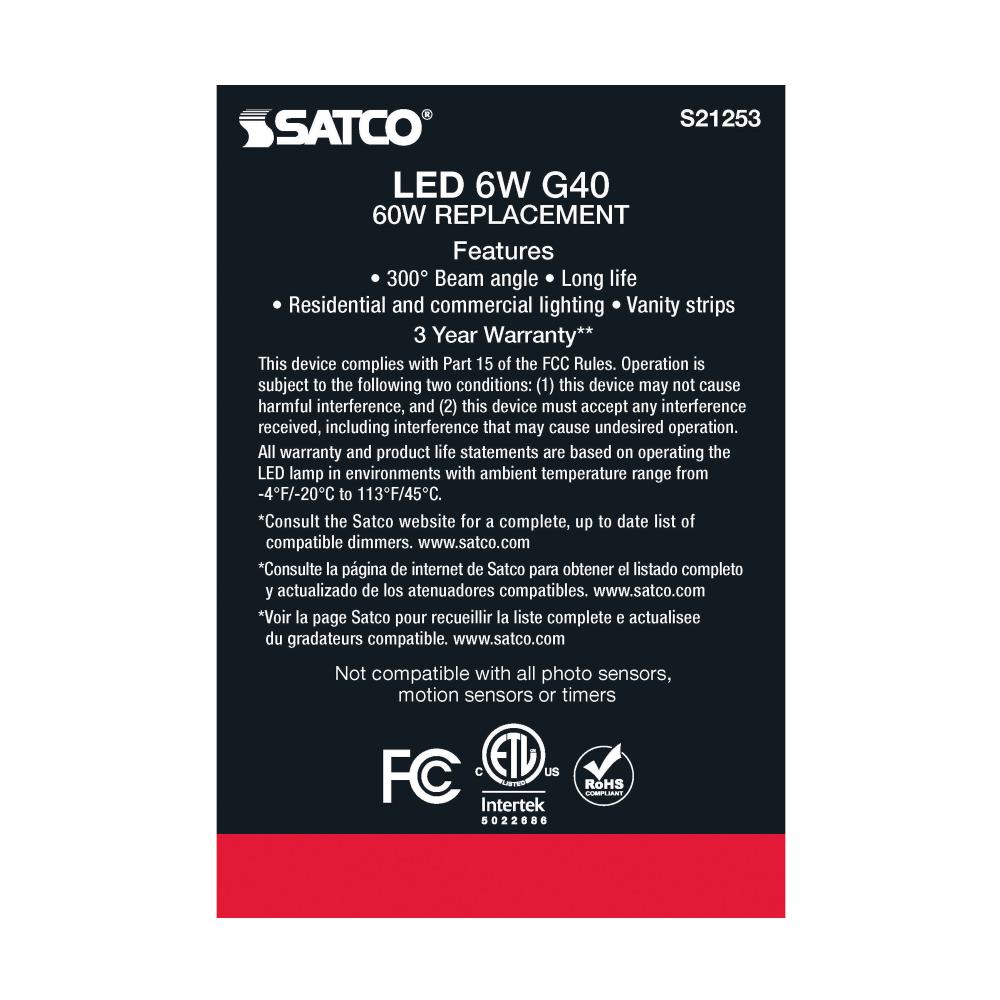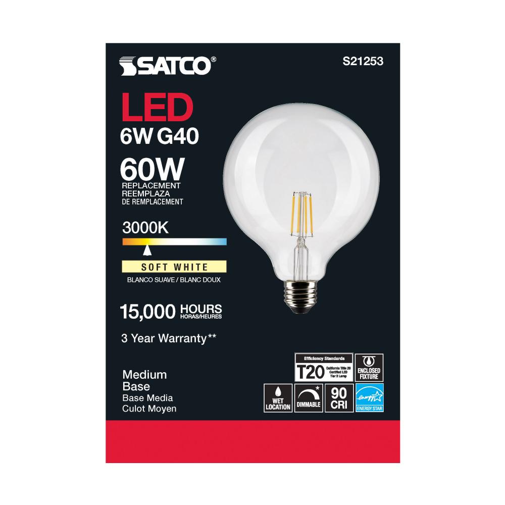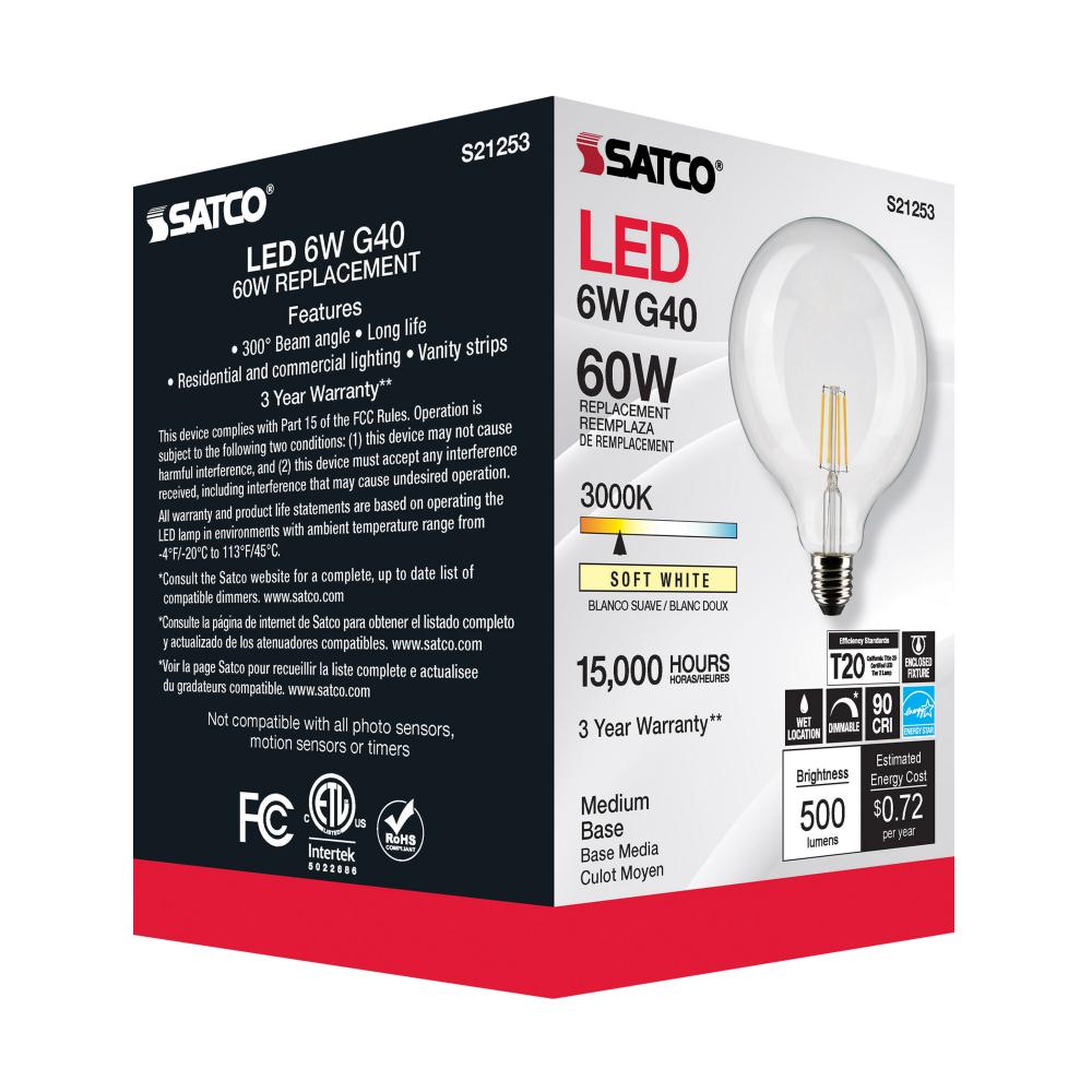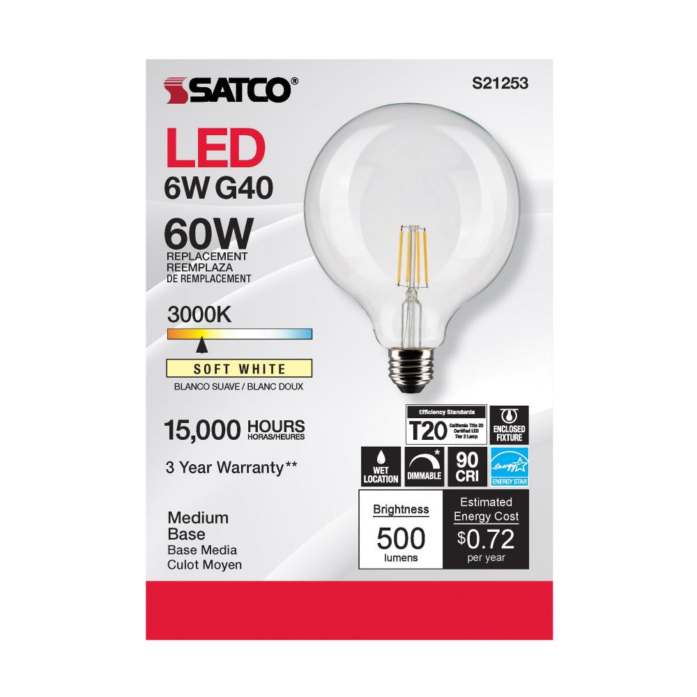 Satco's S21253 6-watt LED lamp is traditional, yet contemporary with its vintage style and energy saving LED technology. Elegantly illuminate any room in the house with this dimmable, globe shaped bulb. Sophisticated and modern, this lamp delivers 15,0