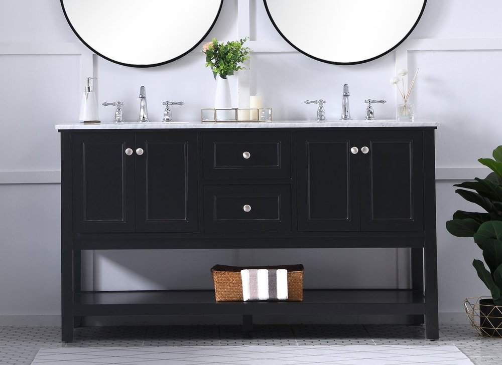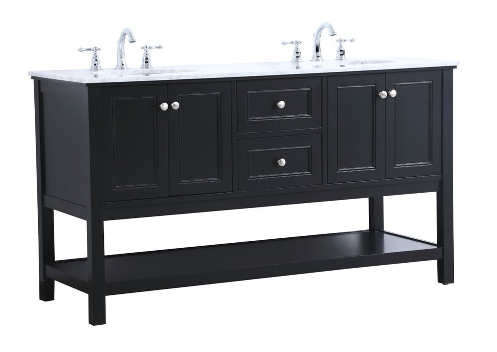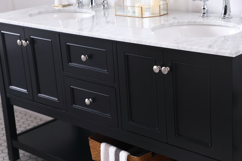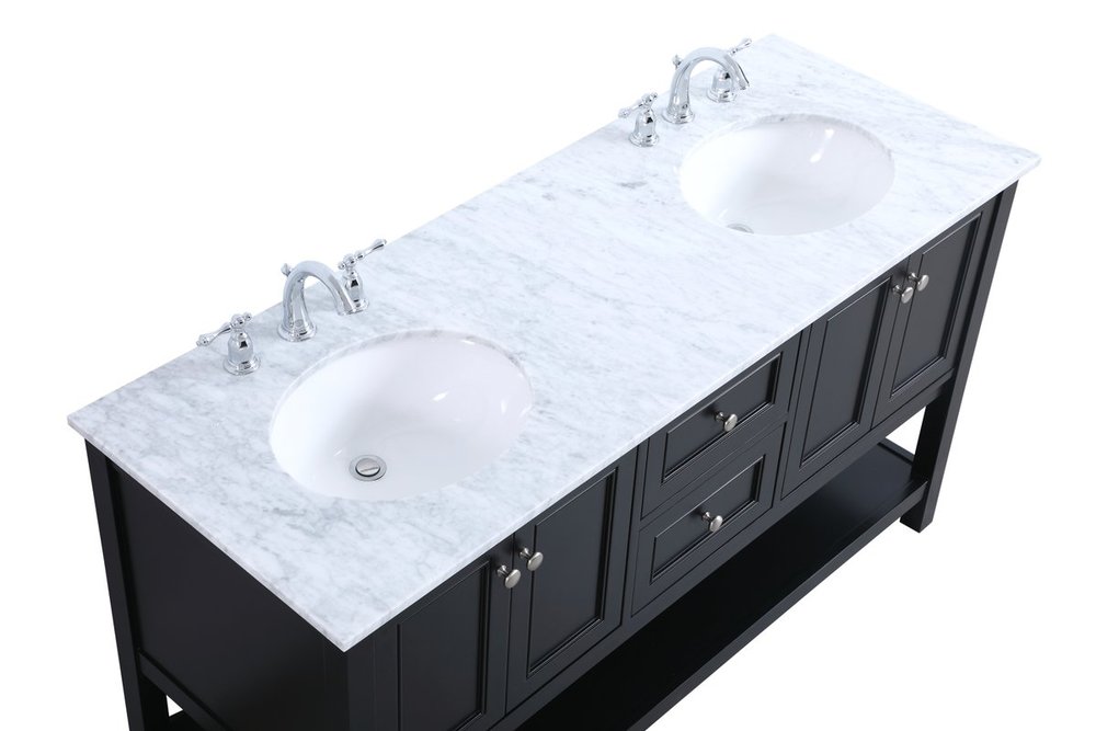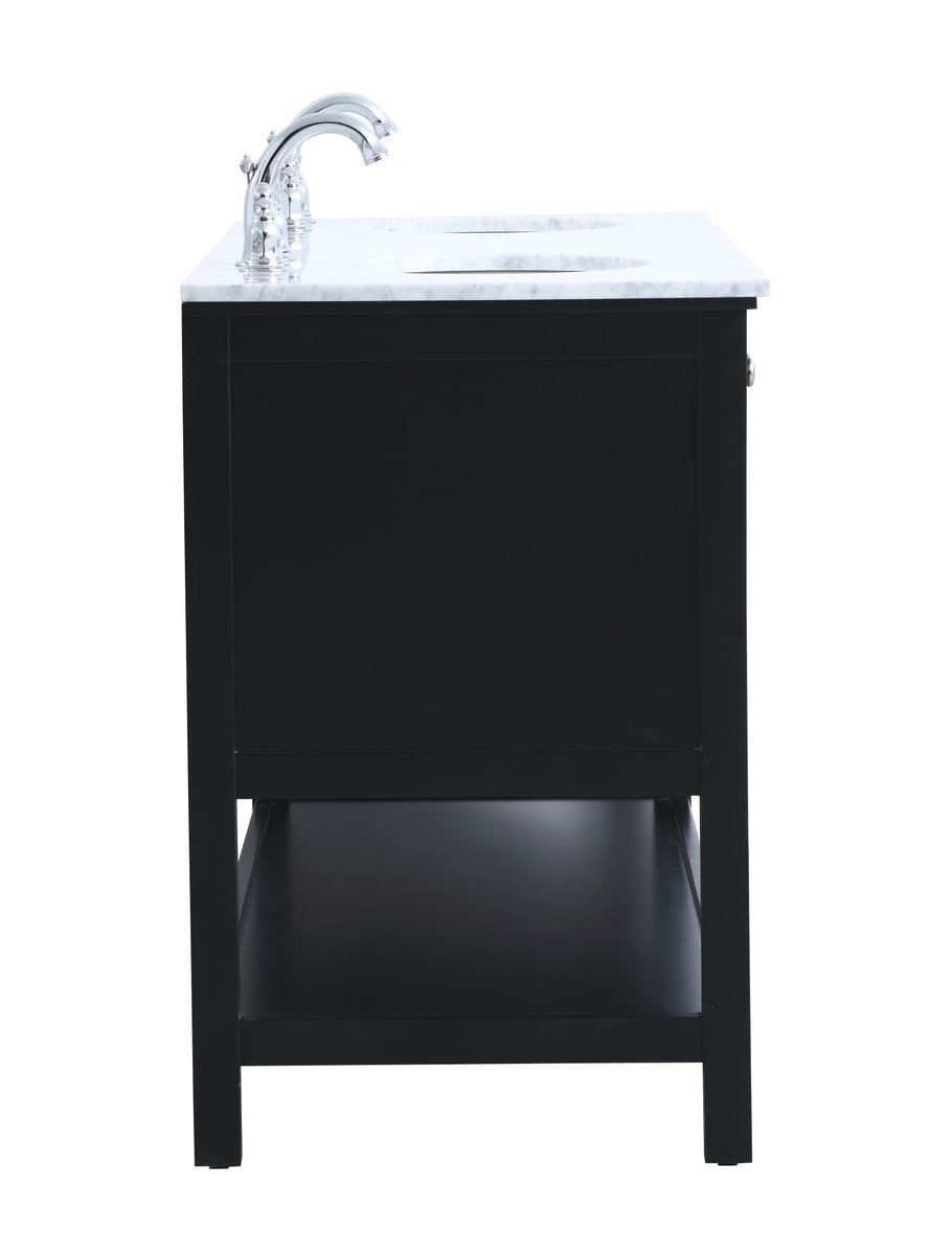 Create a refined and relaxing bath space with this contemporary design vanity, presenting its simplicity and clean straight lines in a minimalist appeal. This 48" freestanding vanity, crafted of solid poplar wood in black finish, provides ample storage within its double center drawers and 4 side doors, all equipped with soft closing mechanism and accentuated with gleaming chrome hardware. Rounding out the design is a luxurious Itallian Carrara white marble countertop and double white porcelain under-mount oval sink.