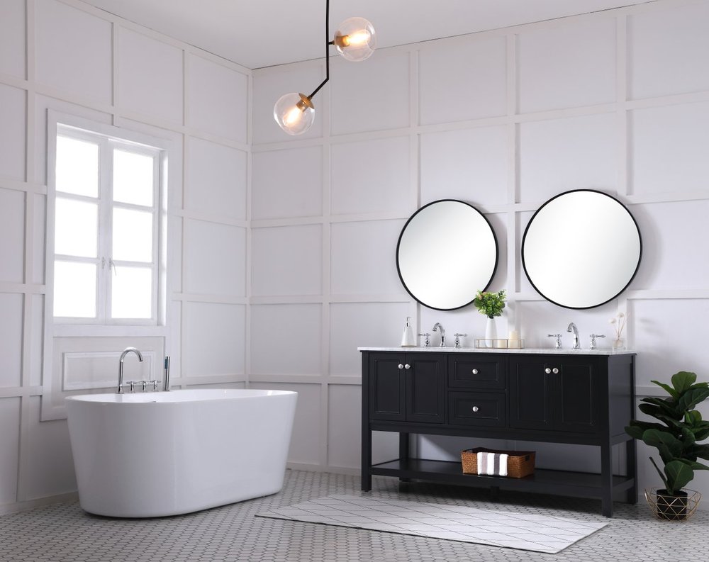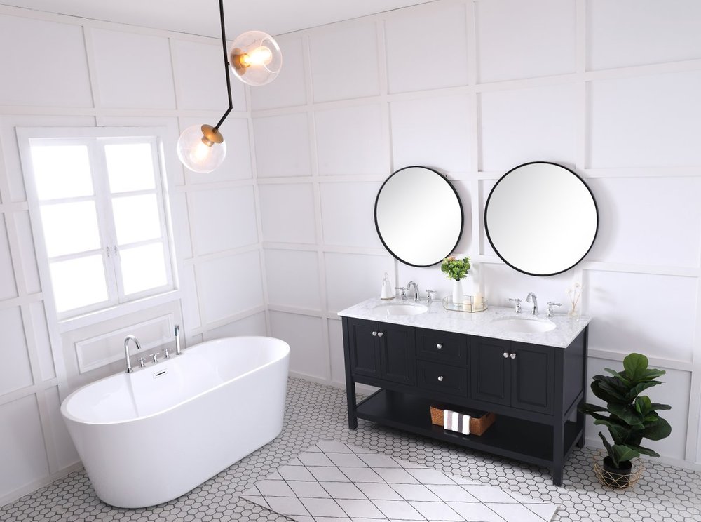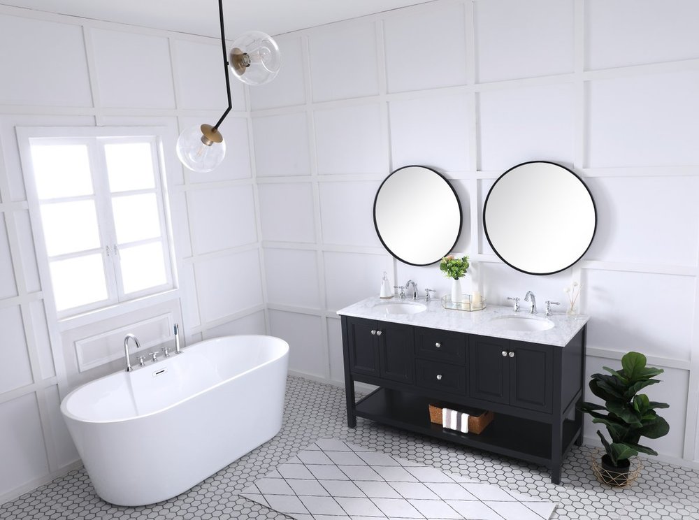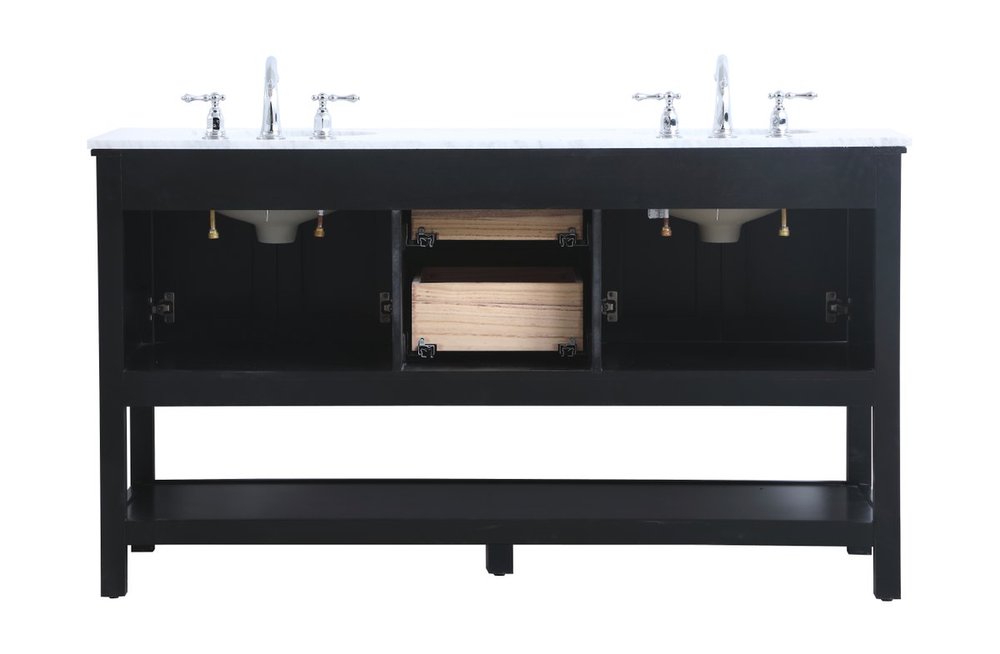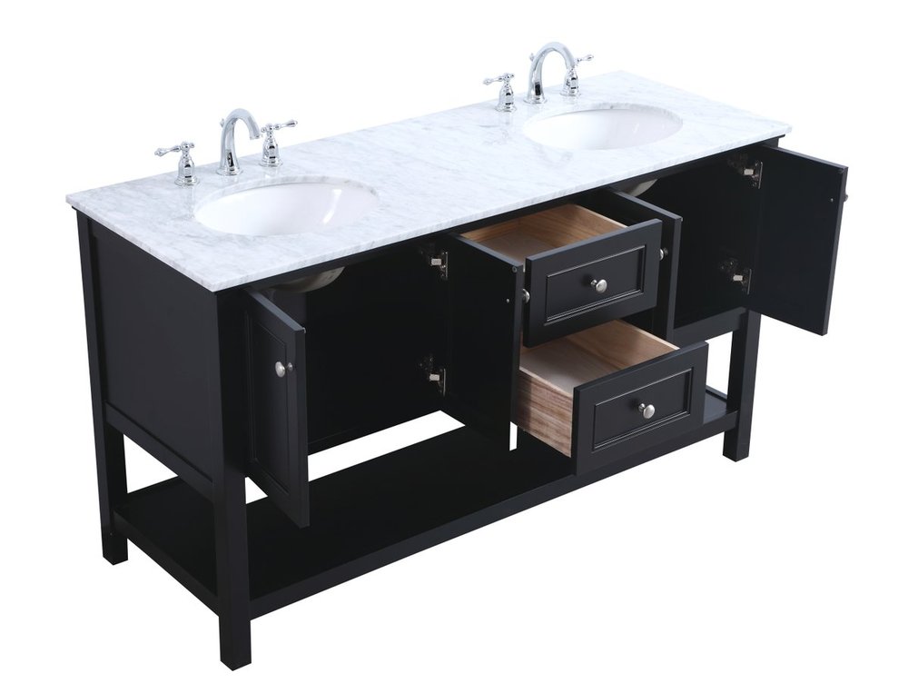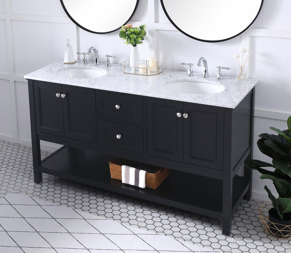 Create a refined and relaxing bath space with this contemporary design vanity, presenting its simplicity and clean straight lines in a minimalist appeal. This 48" freestanding vanity, crafted of solid poplar wood in black finish, provides ample storage within its double center drawers and 4 side doors, all equipped with soft closing mechanism and accentuated with gleaming chrome hardware. Rounding out the design is a luxurious Itallian Carrara white marble countertop and double white porcelain under-mount oval sink.