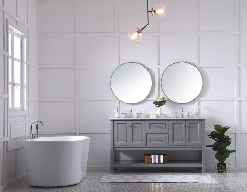 Create a refined and relaxing bath space with this contemporary design vanity, presenting its simplicity and clean straight lines in a minimalist appeal. This 60" freestanding vanity, crafted of solid poplar wood in a soft-grey finish, provides ample storage within its double center drawers and 4 side doors, all equipped with soft closing mechanism and accentuated with gleaming chrome hardware. Rounding out the design is a luxurious Itallian Carrara white marble countertop and double white porcelain under-mount oval sink.