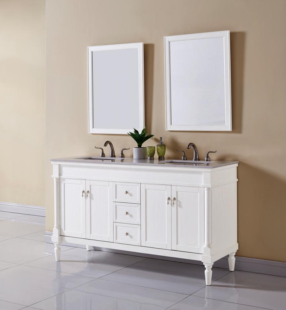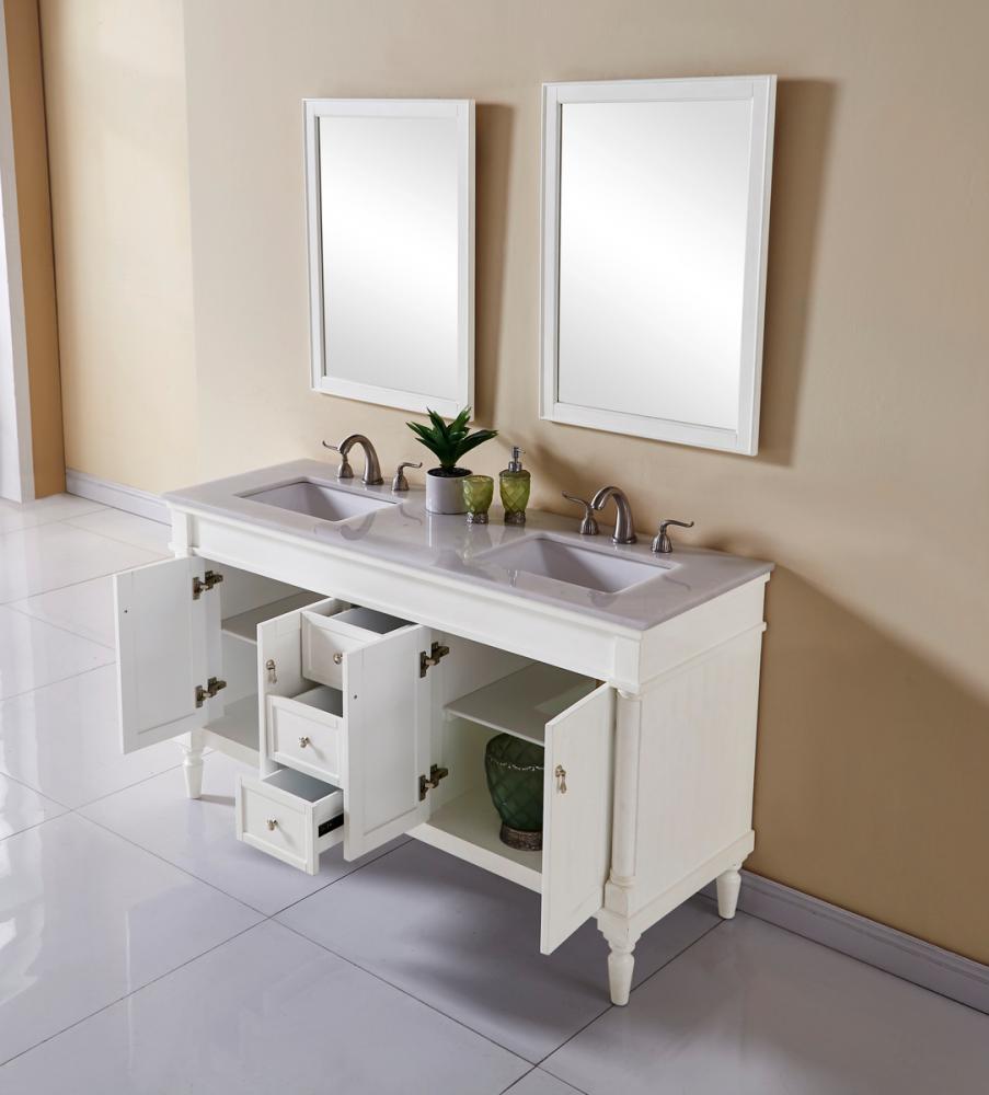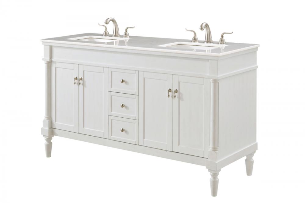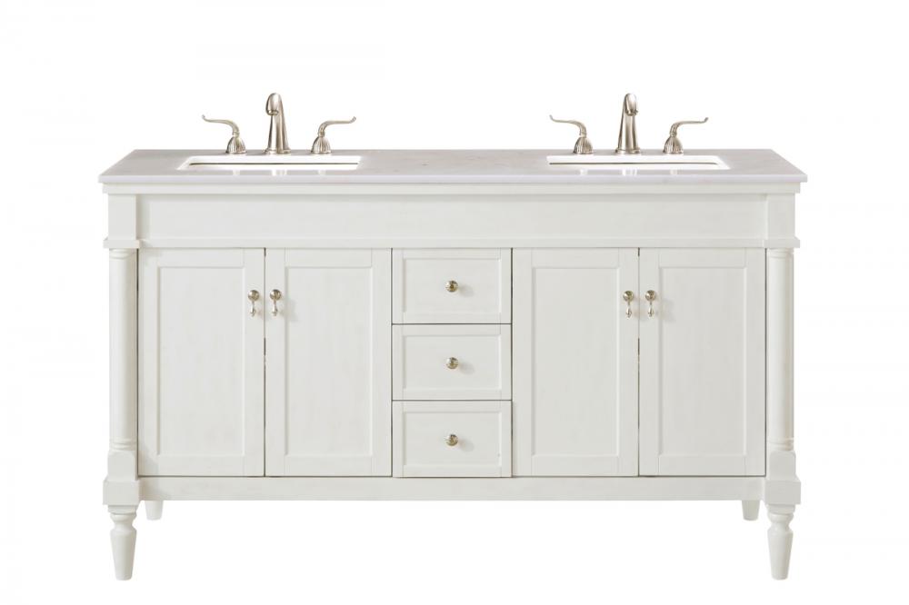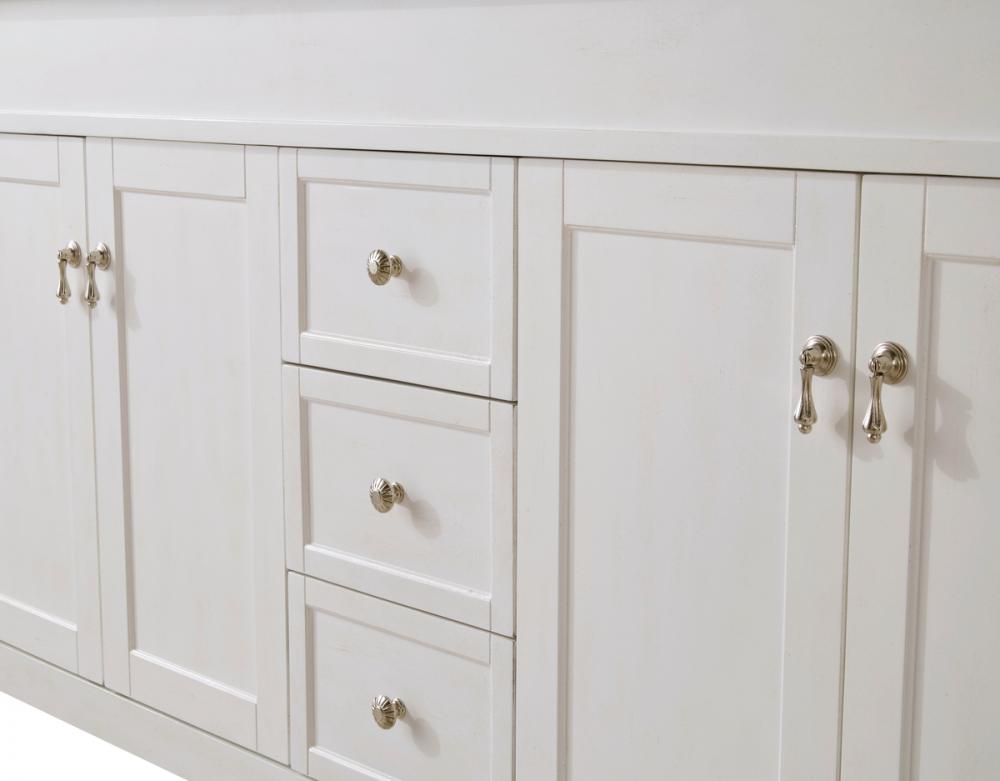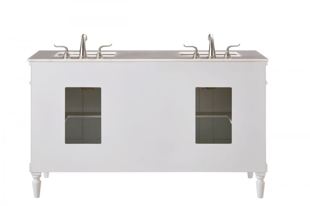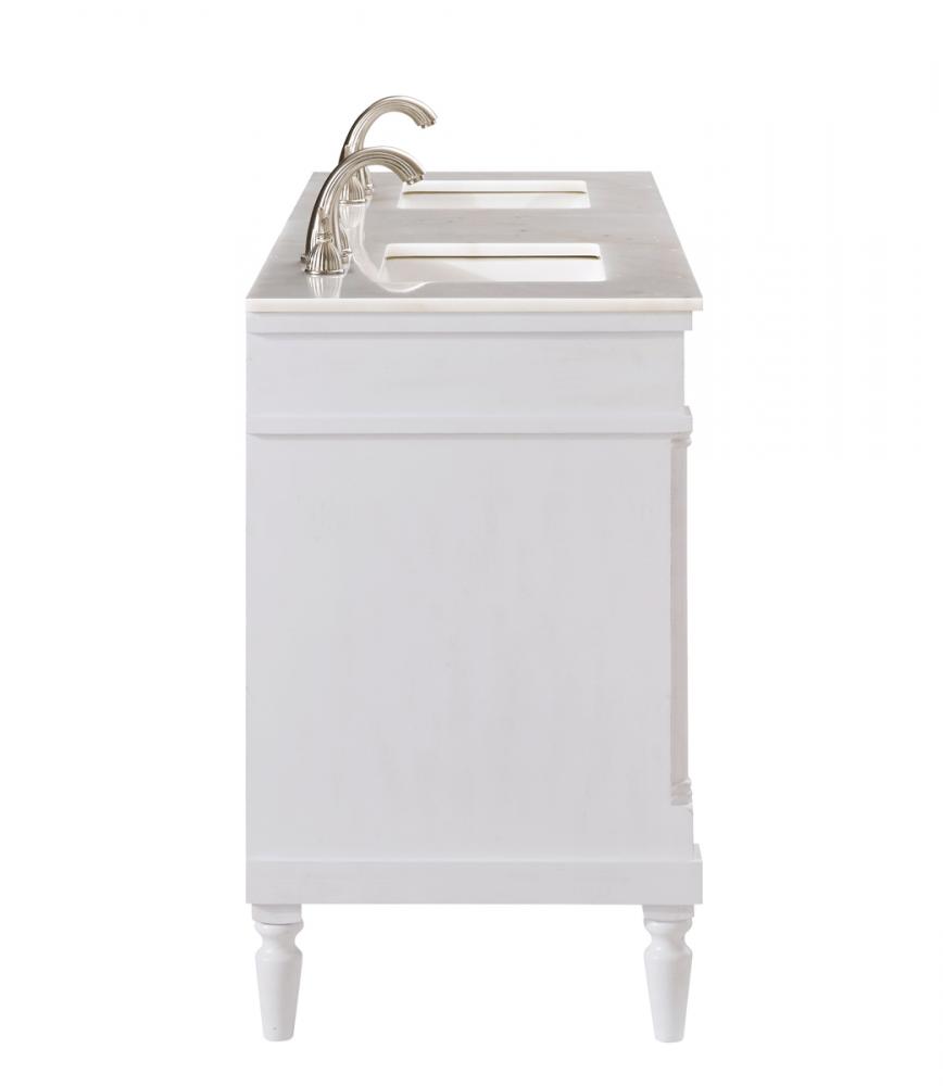This traditionally styled, yet fashionably designed vanity can add distinction and grace to your home or office bathroom. Beautifully combining a lustrous natural white marble countertop with 2 large rectangular white porcelain under mount sink, and a hand painted antique white cabinet with 3 full extension drawers and 4 doors with shelf inside, brushed steel door pulls, standing on turned, tapering legs. You’ll enjoy its charming allure for many years to come. Measurements: W60” x D21” x H35”