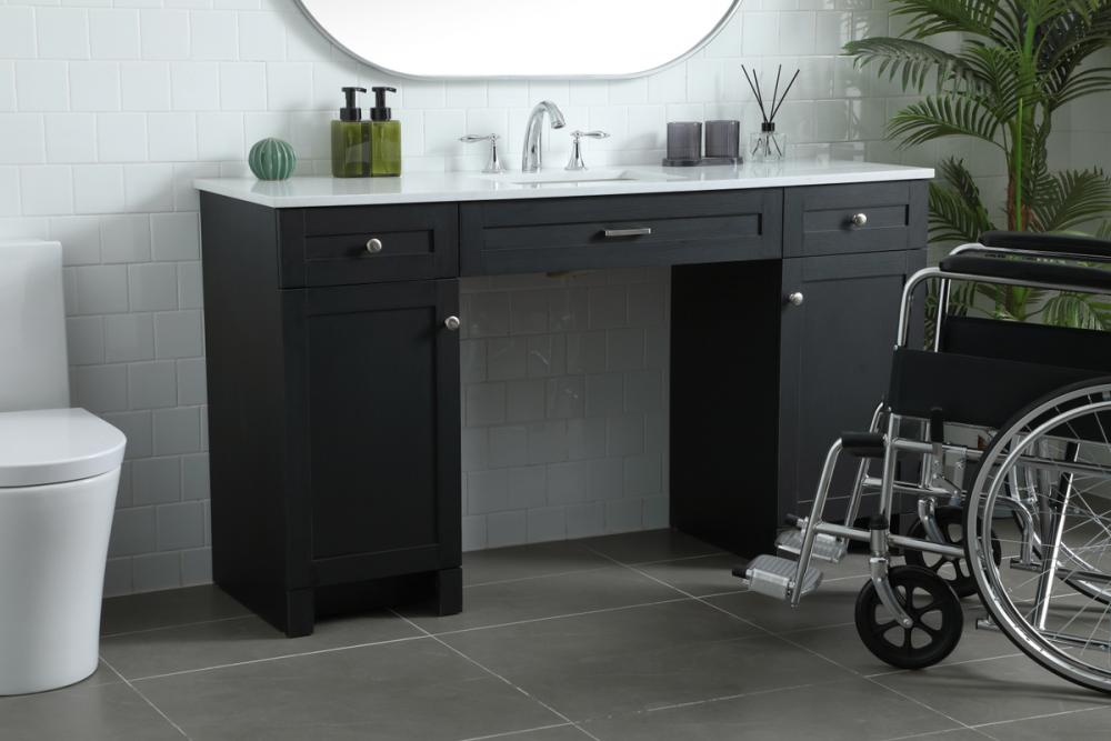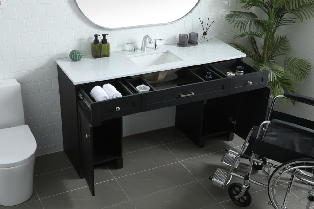 Step into a bathroom oasis that redefines inclusivity and elegance with our Handicap ADA Compliant Bathroom Vanity. Designed with careful consideration for accessibility, this vanity accommodates wheelchair access effortlessly. The undermount porcelain sink, set upon a durable Calacatta look engineered marble stone top, brings an air of opulence to your space. Customize your vanity with the versatile predrilled countertops, allowing you to choose faucets that suit your taste. The soft closing drawers ensure a serene and peaceful environment, complemented by the fully assembled and ready-to-use design for instant gratification. The optimal knee clearance and discreetly placed overflow hole in the porcelain sink further enhance the functionality of this vanity. With three functional drawers, two cabinets, and stainless steel knobs, organization and aesthetics seamlessly intertwine. Choose our Handicap ADA Compliant Bathroom Vanity for a space that embodies accessibility without compromising on luxury. Redefine your daily rituals with a vanity that caters to everyone's needs while adding a touch of sophistication to your bathroom sanctuary.