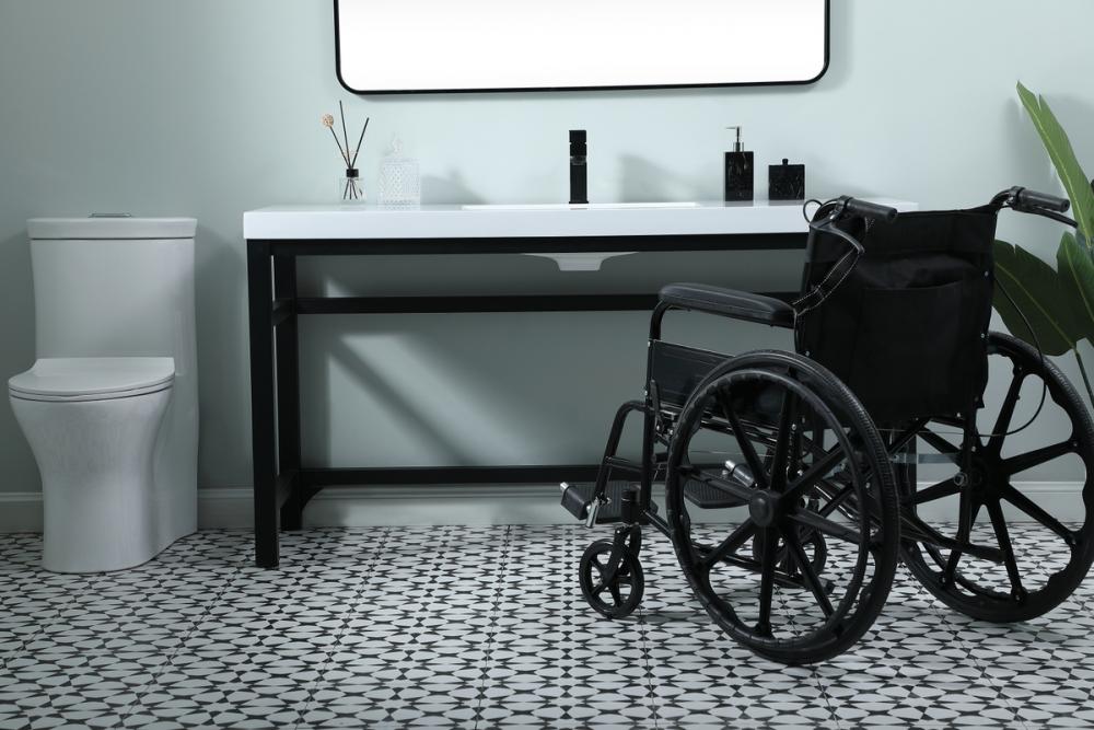 The open design beneath the vanity provides ample storage space for bathroom essentials, making it easy to access items while sitting in a wheelchair.