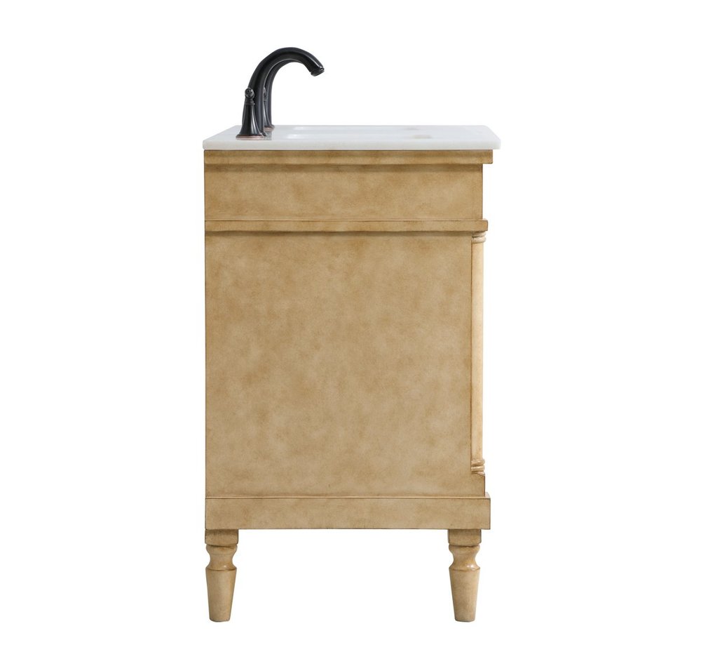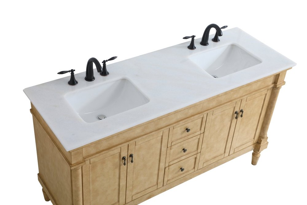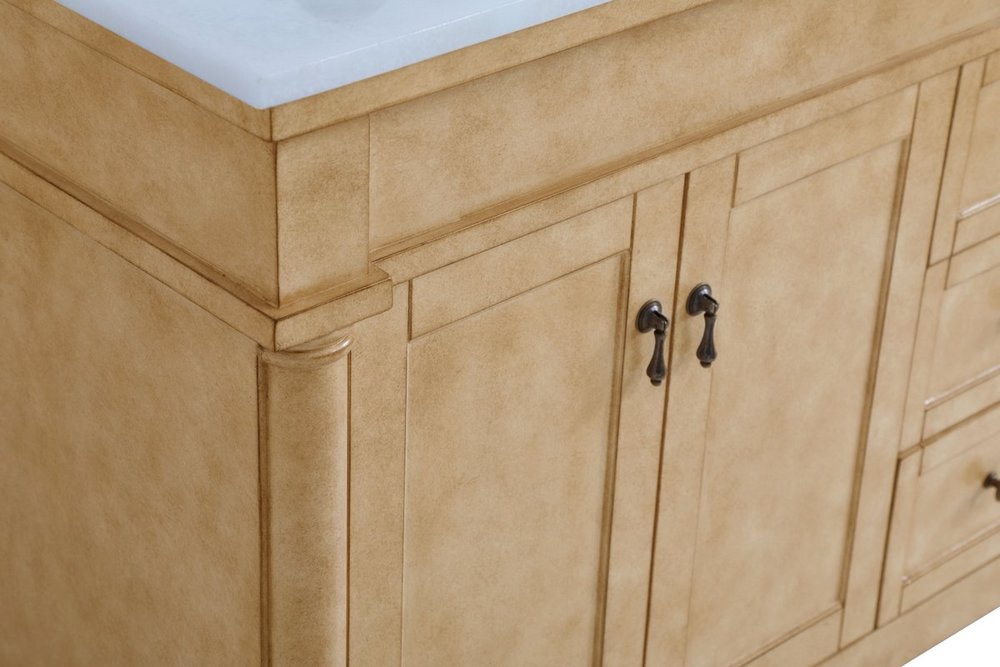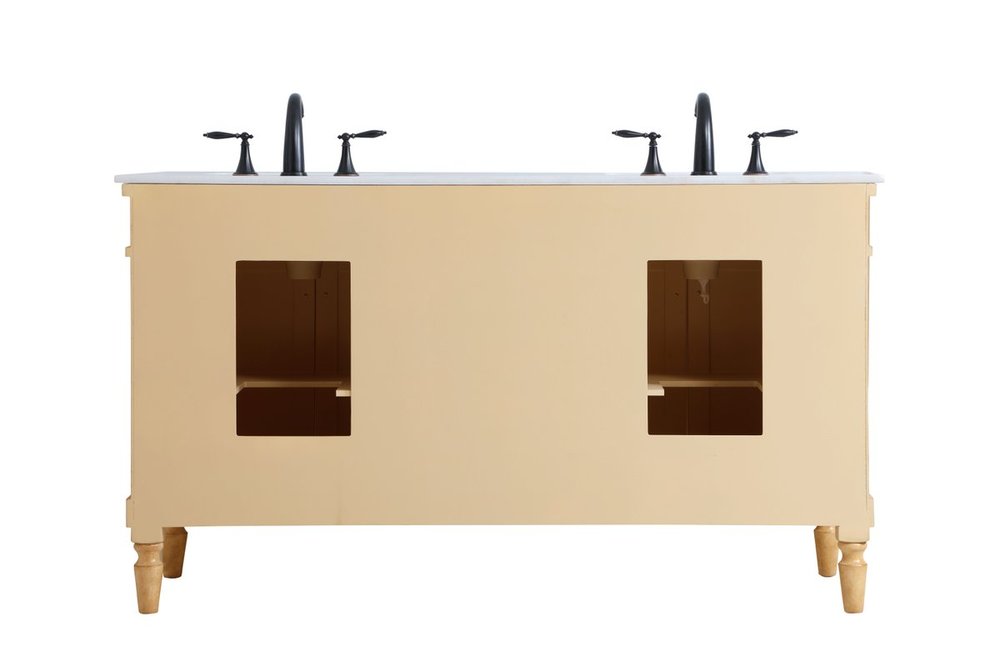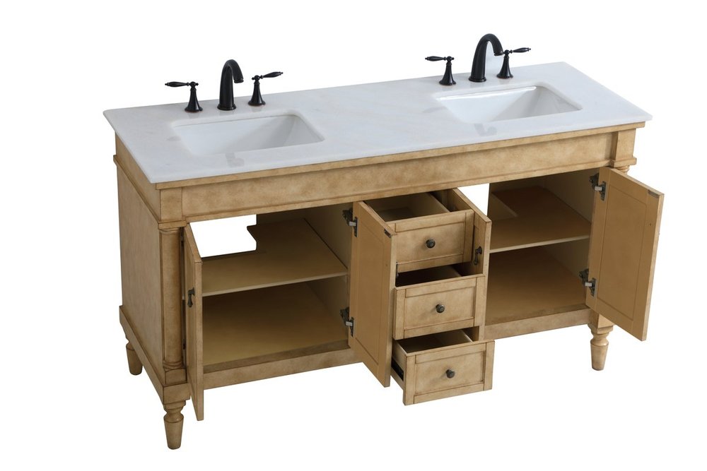 The subtle beauty of the Lexington collection 60" double sink vanity in an antique beige finish exudes comfortable luxury. Its modern, yet traditional beauty will surely dress up your bathroom or powder room without any fuss. The white marble countertop with occasional coffee color veins and porcelain undermount sinks show quiet opulence, and the legs support upright without fail. Antique bronze hardware complements the refined beige finish, with pulls adorning the four cabinet doors and ornate knobs dressing the three center drawers, showcasing ample storage space within. Plentiful countertop space makes it easy to get ready without bumping into the other person. Whether this vanity is in your bathroom or for guests, its presence will surely elevate the aesthetics of your room.