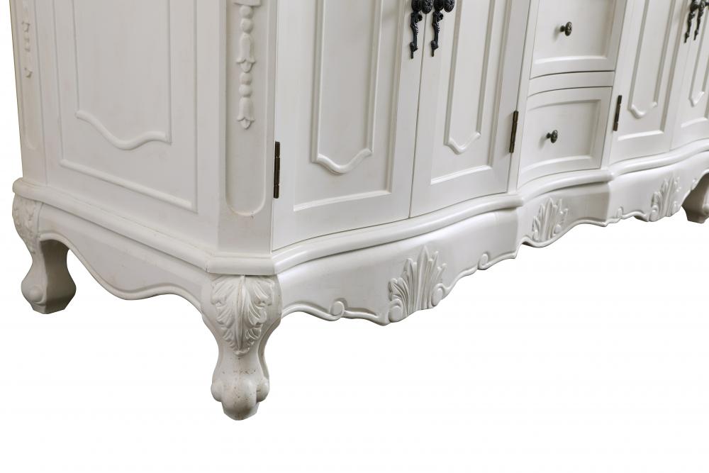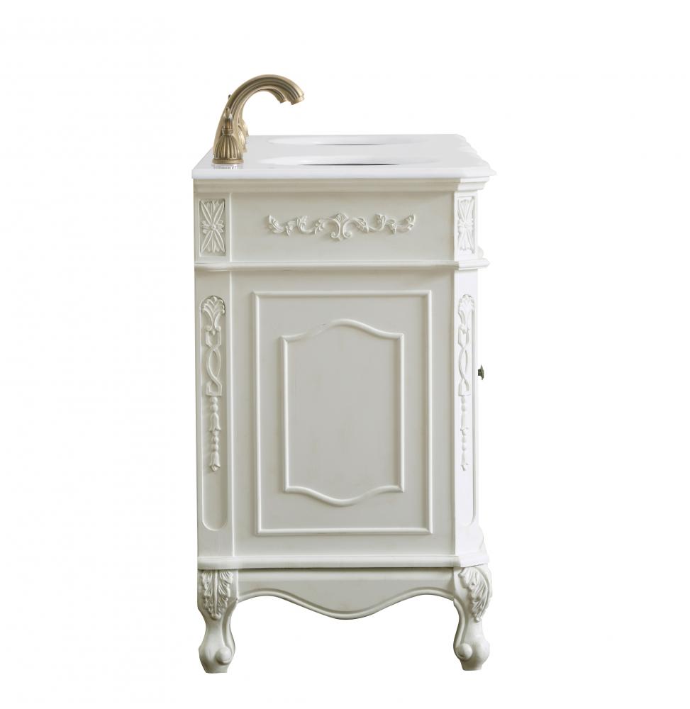 This superb balance of timeless tradition and opulent beauty in a engineered marble-topped vanity will certainly enhance the aesthetics of any home or office bathroom! Featuring an ivory white durable engineered marble countertop complimenting the hand painted cabinet with a delicate carved floral design, stands on stylishly carved solid wood French scroll feet. Don't let the design fool you, the engineered marble countertop and porcelain undermount sink allows for space to get ready, while the antique bronze hardware allows you to discover storage spaces with ease. You and your guests will marvel at this vanity that will both store away your bathroom essentials and enhance the aesthetics of your room.