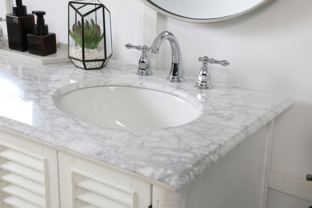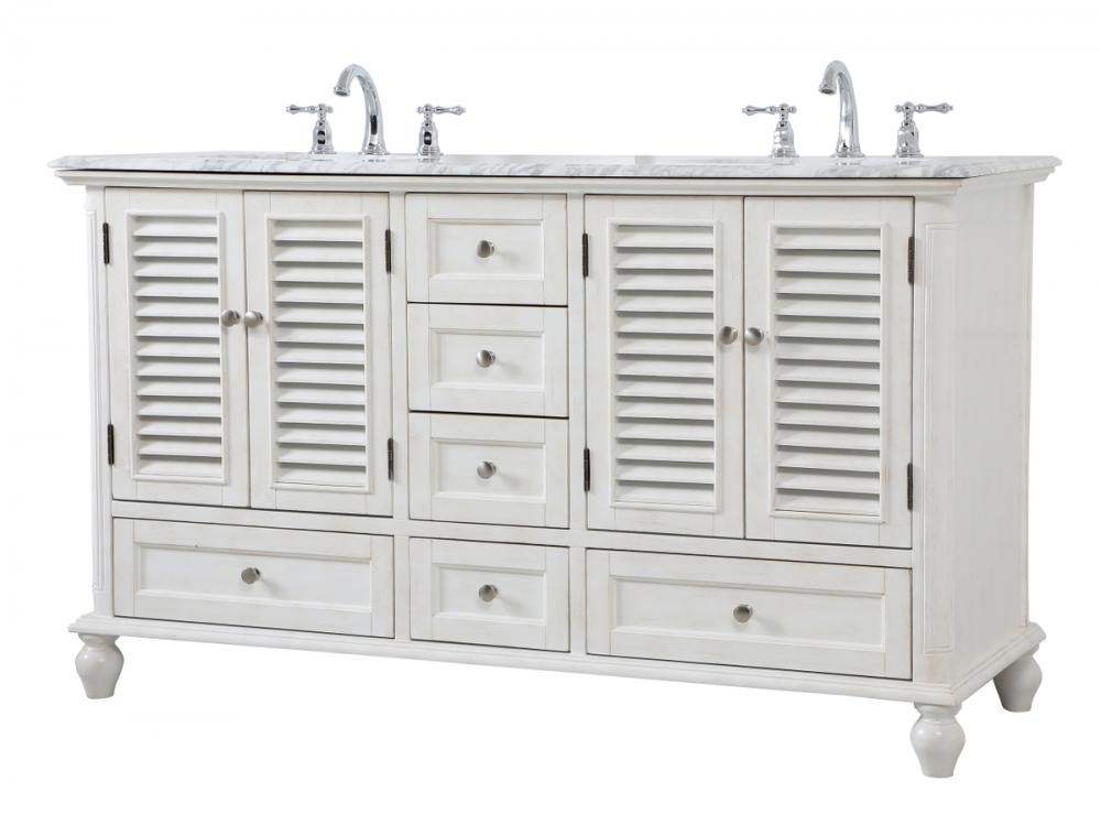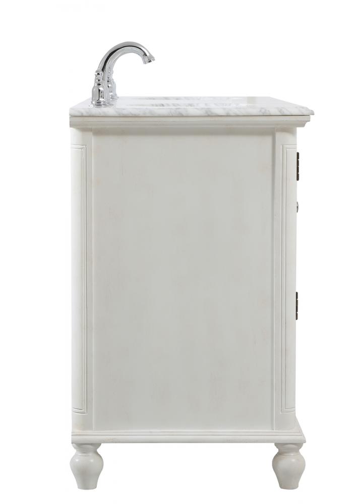 Distressed antique white finish with a luxurious carrara white marble countertop