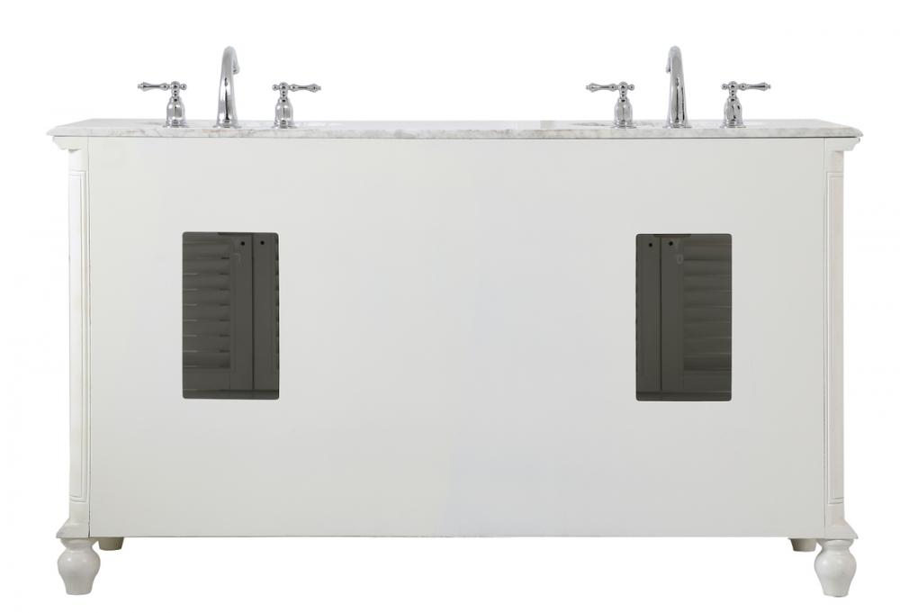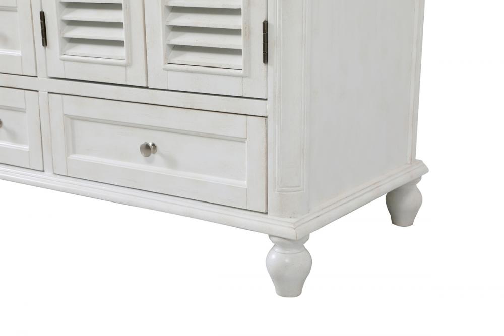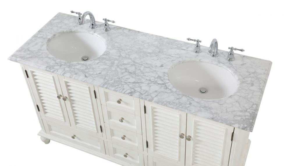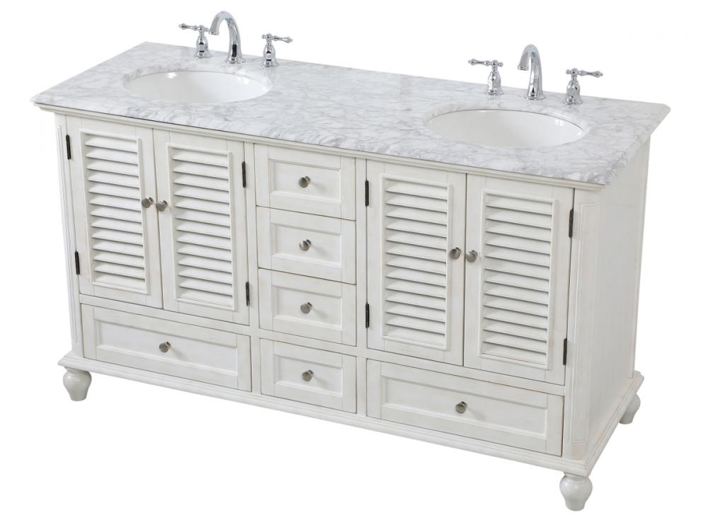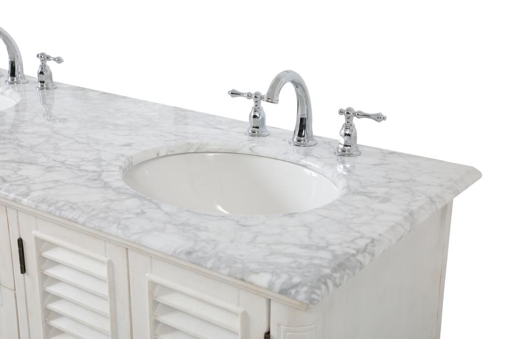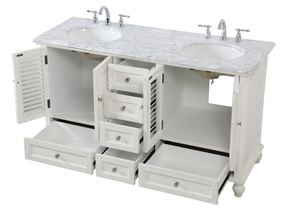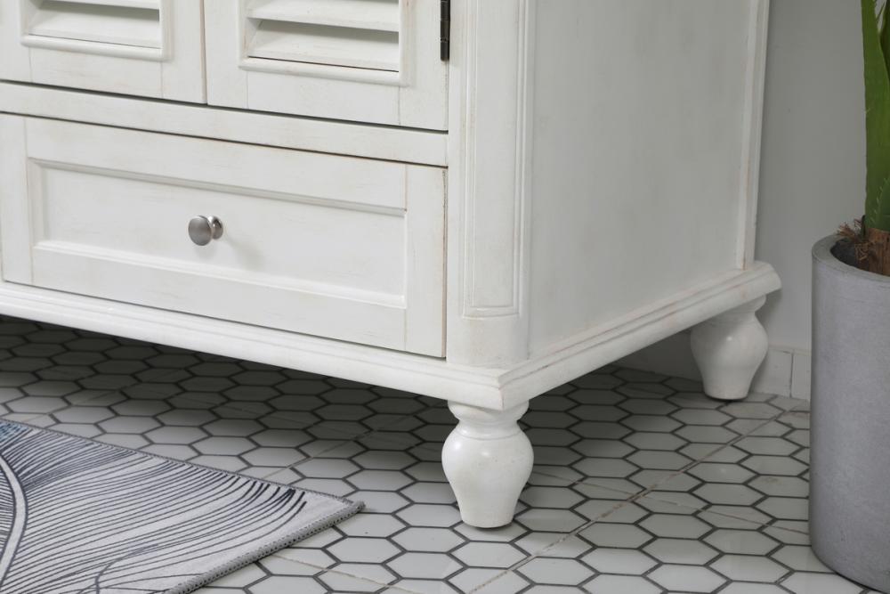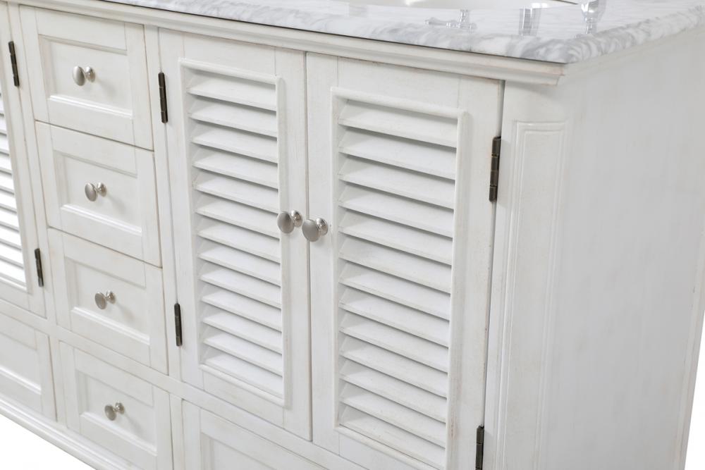 Never compromise beauty--the Rhodes collection stunning vanity in an antique white finish will add lovely sophistication and complement any bathroom or powder room, while utilizing its charm and function to provide you with ample storage spaces. Brushed nickel knobs gently adorn the four shuttered cabinet doors, two ample sized drawers at the base, and four center drawers allowing for you to store away all your bathroom essentials. The Carrara white marble countertop, porcelain undermount sink, dignified subtle engravings on the side edges, and rounded legs all come together to create contemporary beauty. The two porcelain sinks will allow for two people to get ready concurrently without getting in the way of another. Work with your space, and design a beautiful room, no matter the size.