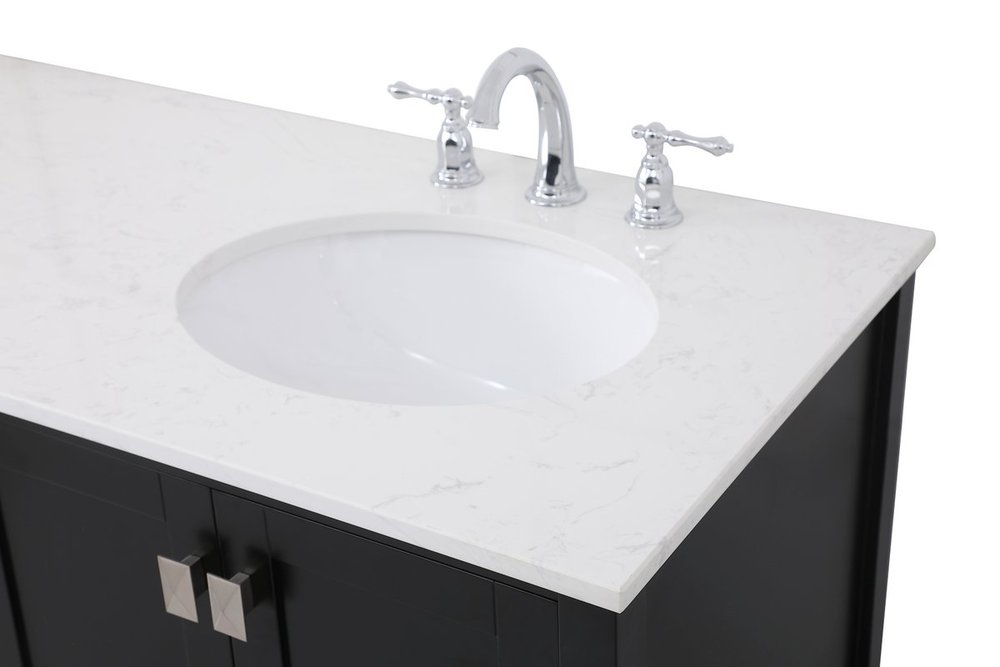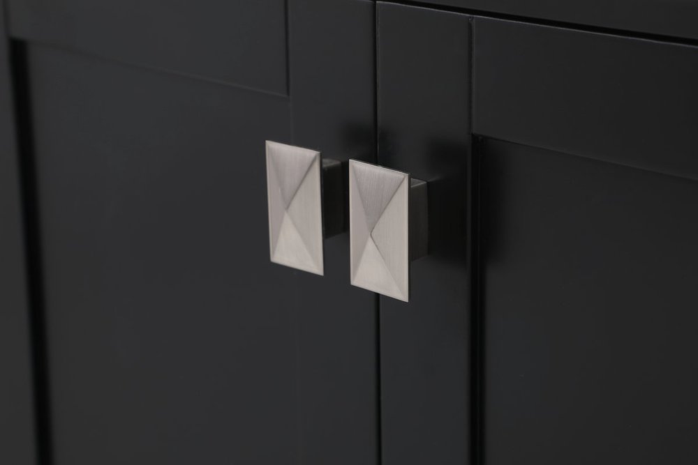 Never compromise beauty--the Irene collection stunning vanity in a black finish will add lovely sophistication and complement any bathroom or powder room, while utilizing its charm and function to provide you with ample storage spaces. Brushed nickel pulls gently adorn the minimalist cabinet doors and drawers at the base, allowing for you to store away your bathroom essentials. The calacatta engineered marble countertop, porcelain undermount sink, dignified subtle engravings on the side edges, and squared legs all come together to create contemporary beauty. Work with your space, and design a beautiful room, no matter the size.