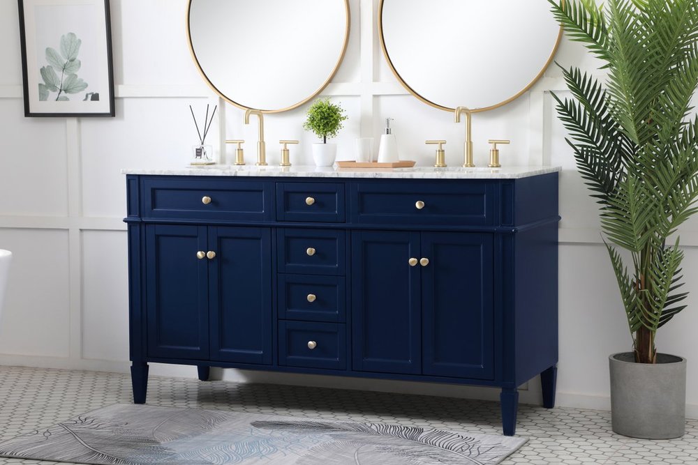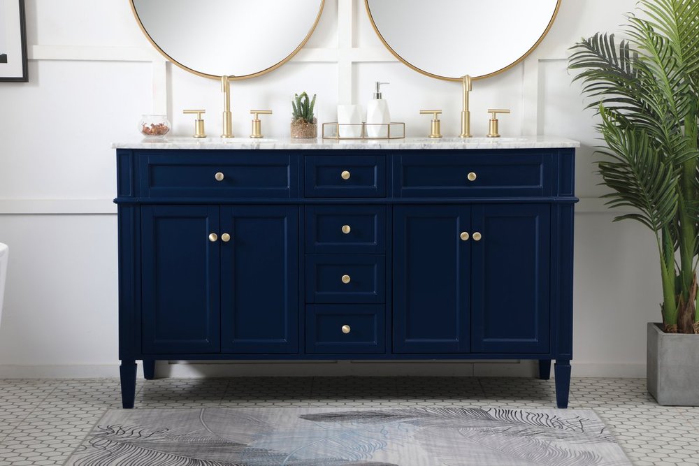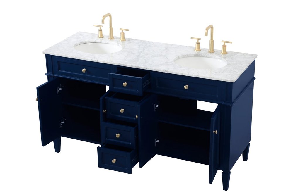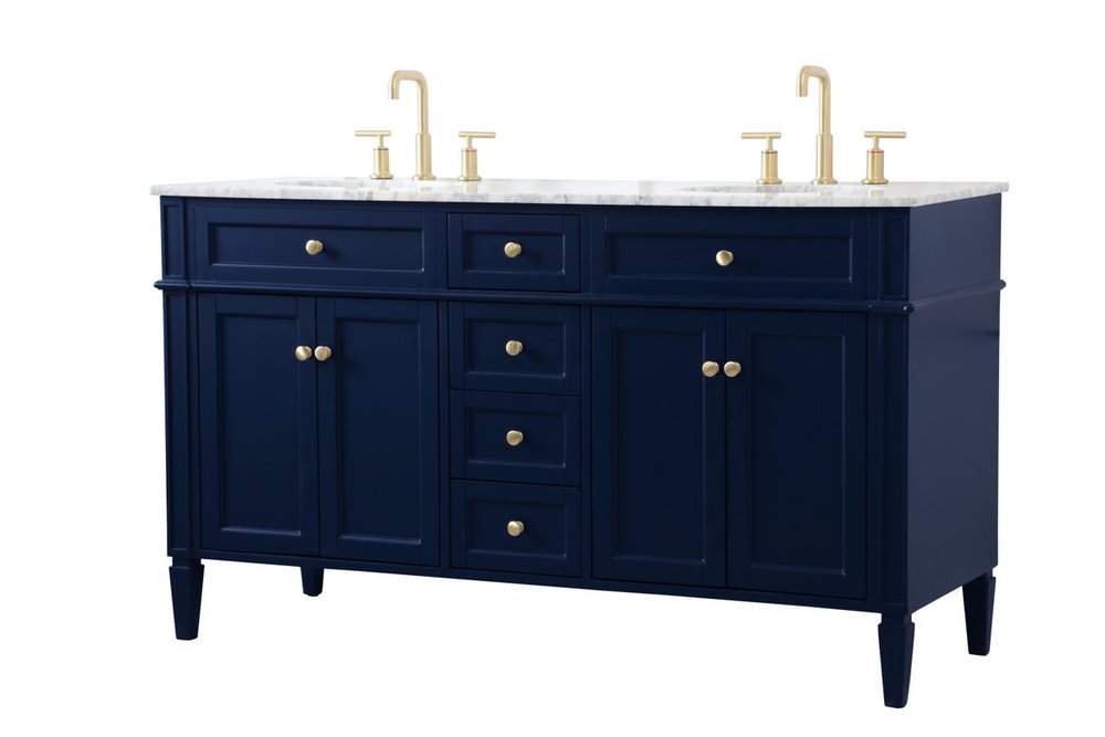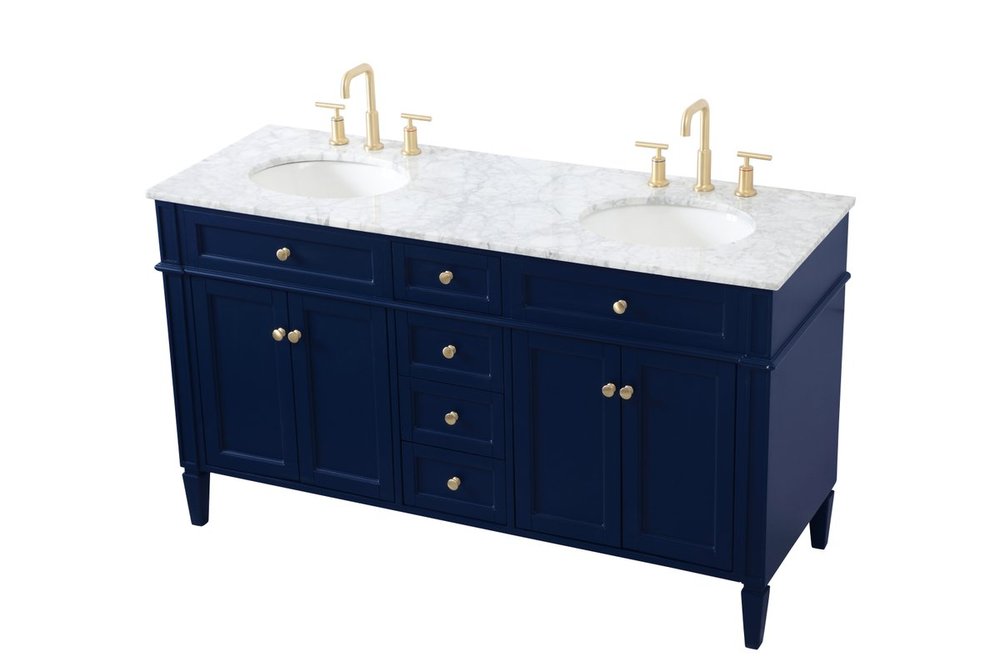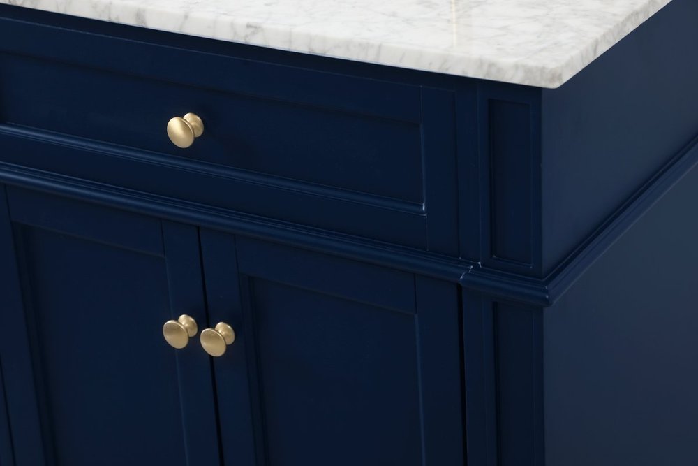 Modern sophistication is defined within the urbane blue finish and brushed gold knobs of this vanity. Its charming style it the perfect addition to any home, and saves space with its storage area hidden behind the four cabinet doors and 4 center drawers. Topped with a Carrara white marble counter top and two porcelain sinks, this design will add everlasting class to your bathroom and powder room.
