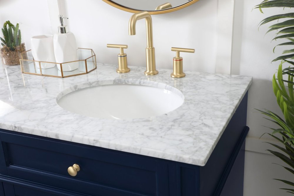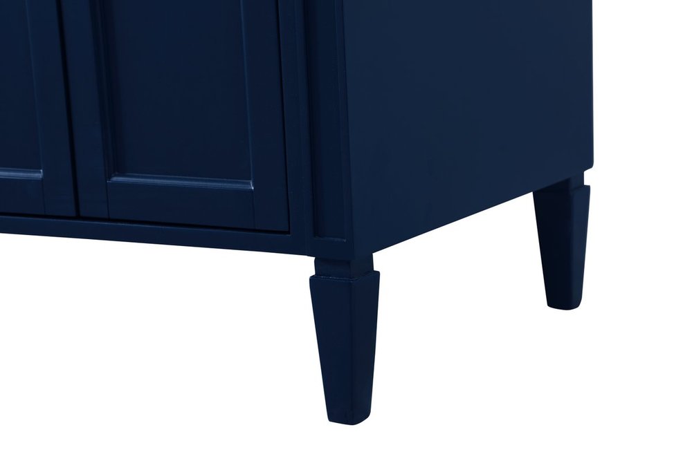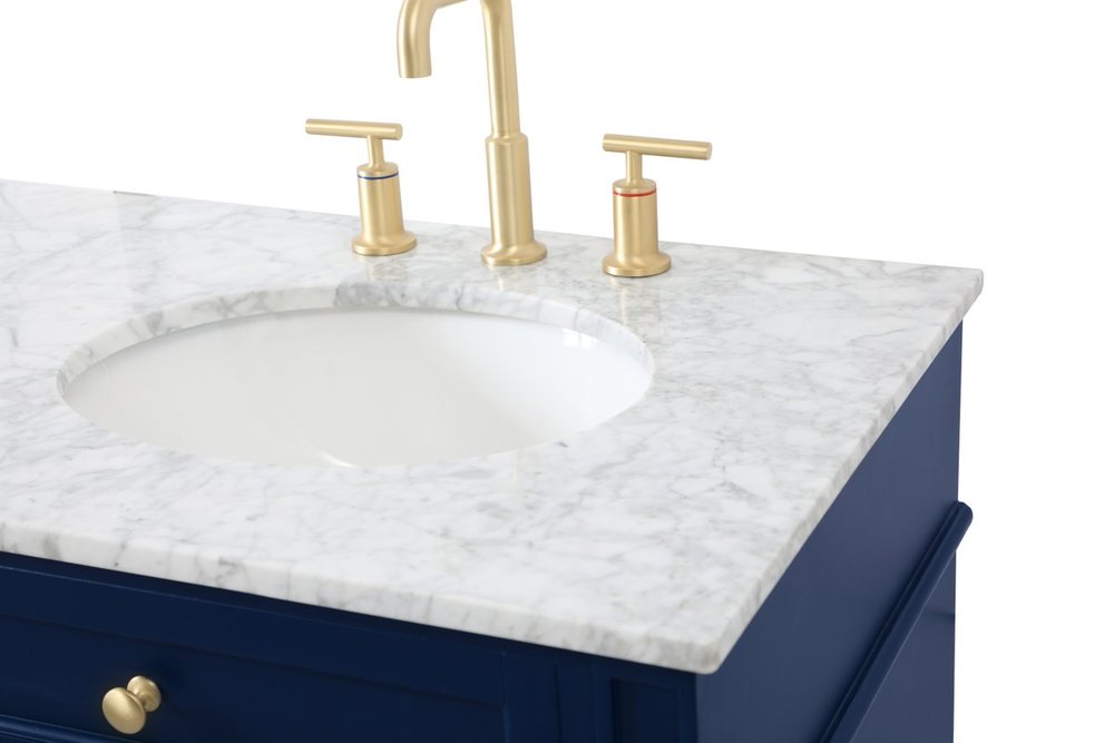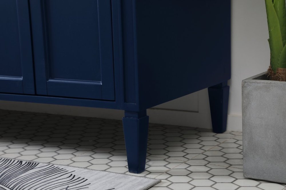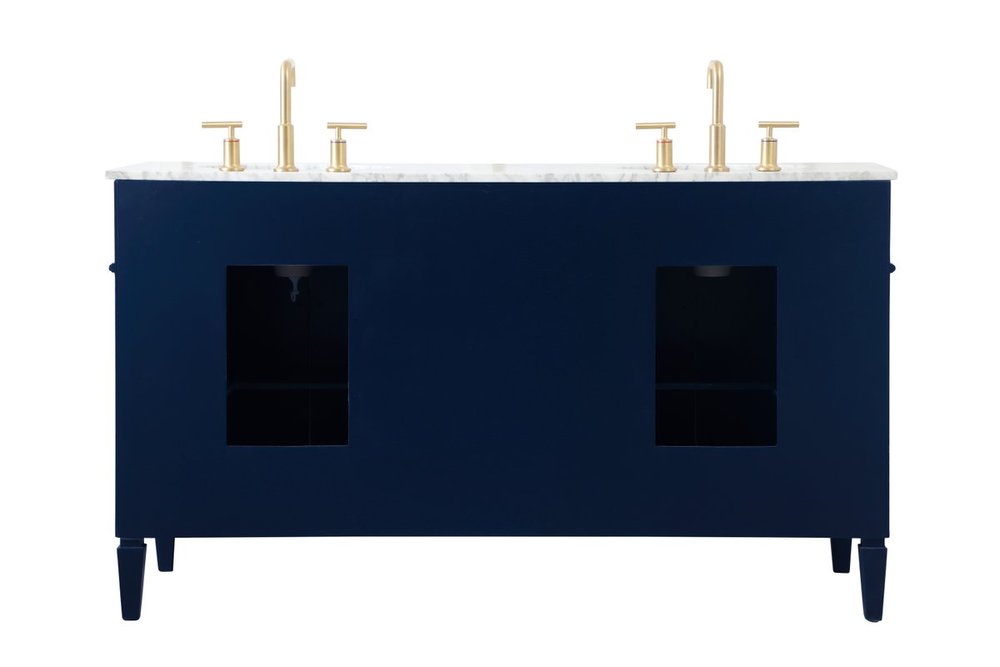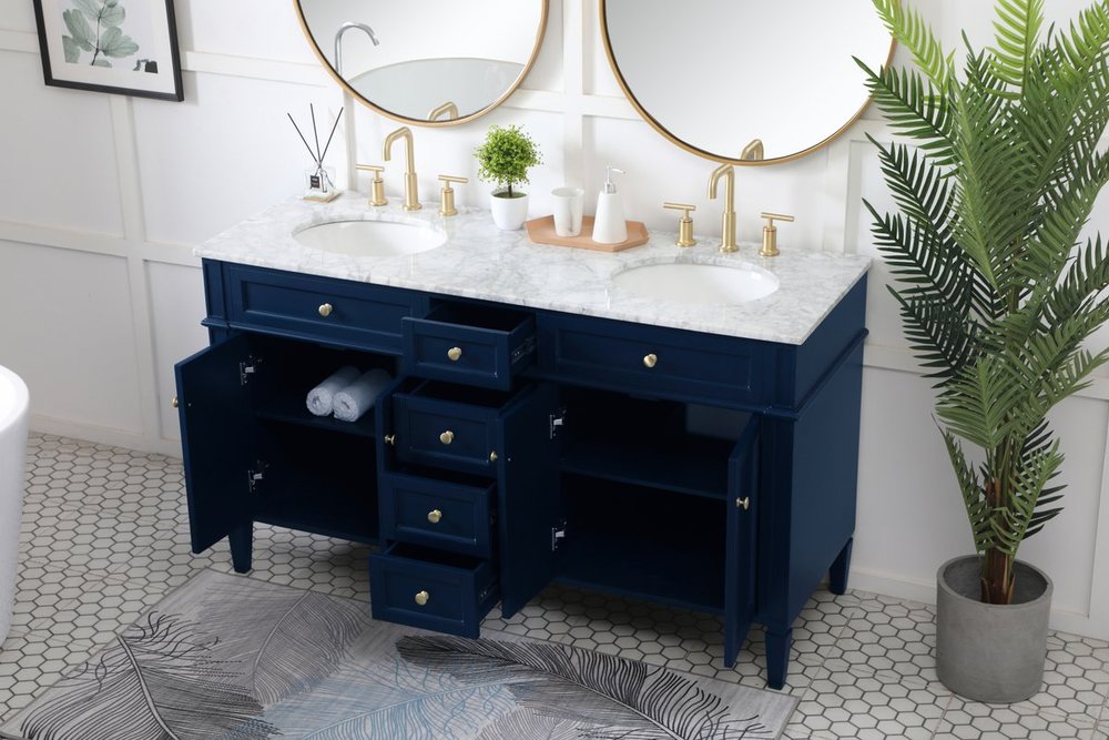 Modern sophistication is defined within the urbane blue finish and brushed gold knobs of this vanity. Its charming style it the perfect addition to any home, and saves space with its storage area hidden behind the four cabinet doors and 4 center drawers. Topped with a Carrara white marble counter top and two porcelain sinks, this design will add everlasting class to your bathroom and powder room.