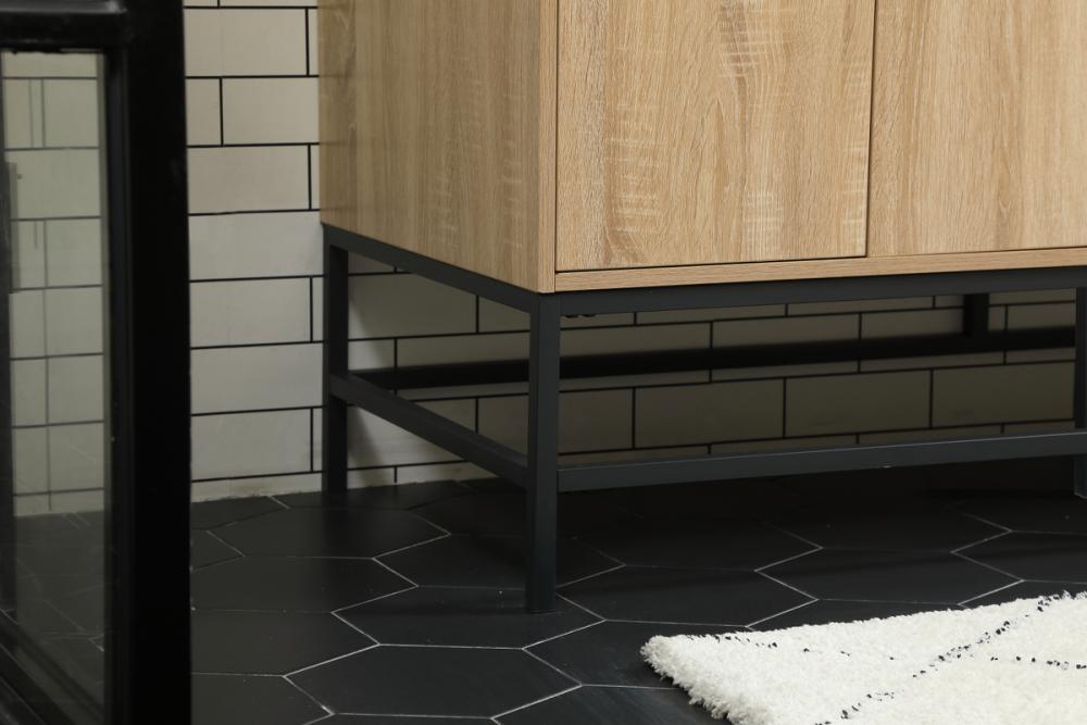 This vanity is a sleek-looking piece of bathroom furniture that is easy to incorporate into your design scheme. The cabinet features a smooth door panel with an oversized steel handle and soft close hinges provide ample room for accessories. Constructed of engineered wood, the powder-coated metal rod legs are an urban industrial look that we love. Minor assembly of the metal legs needed to get this vanity up and running.