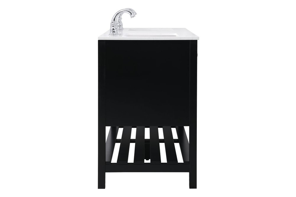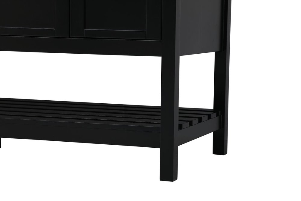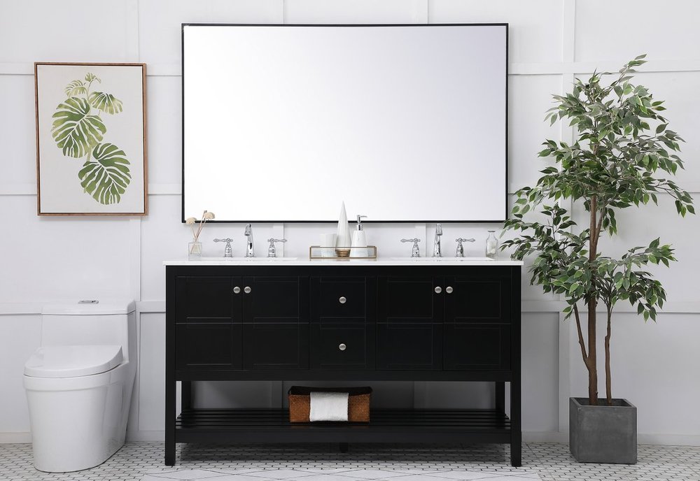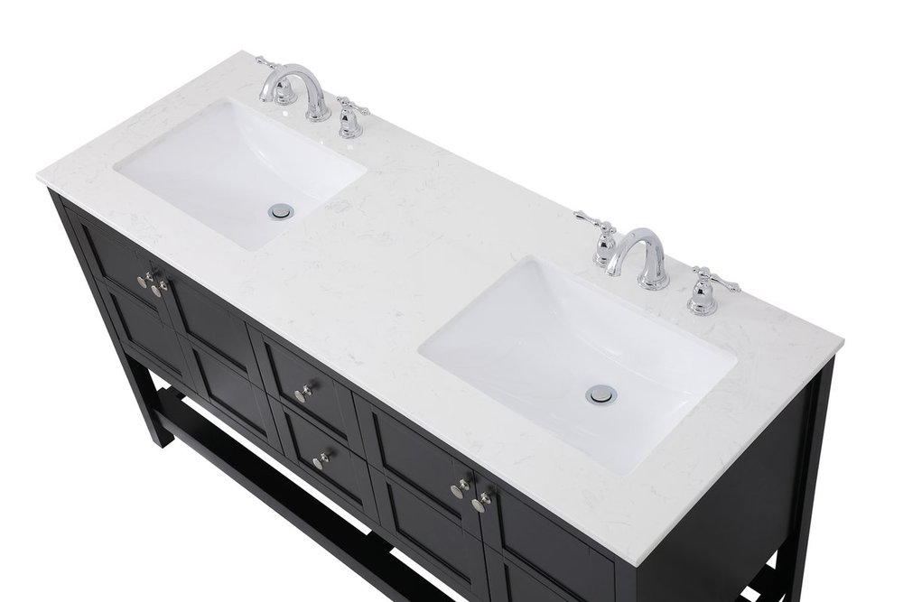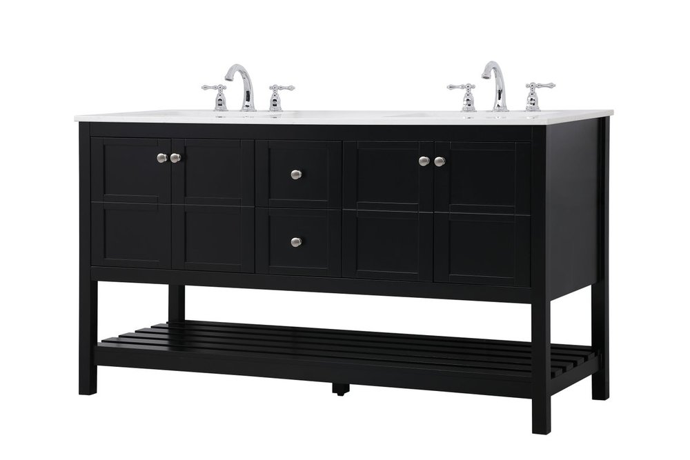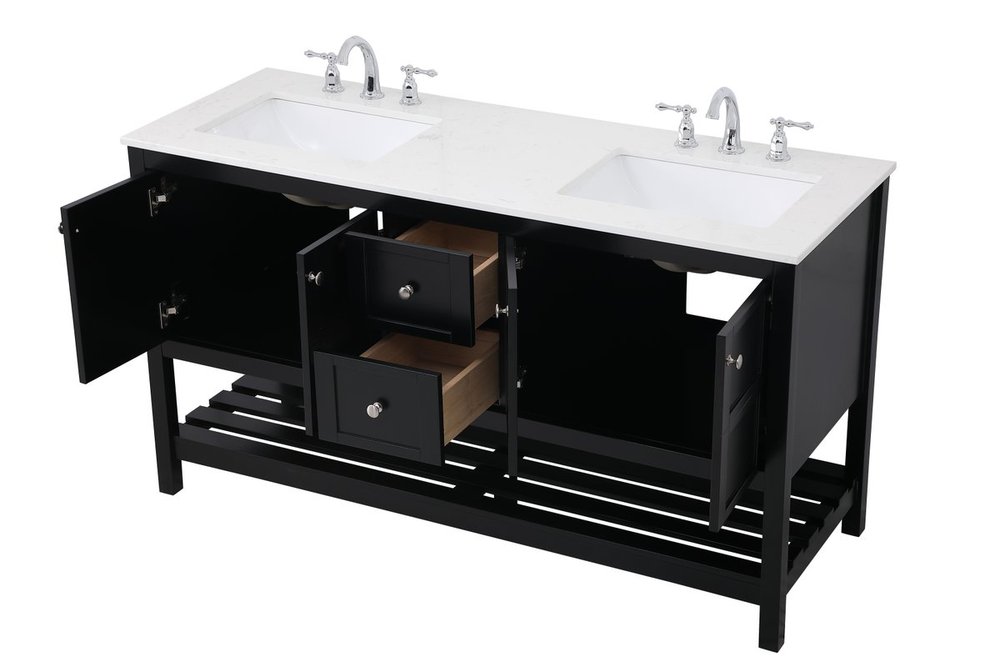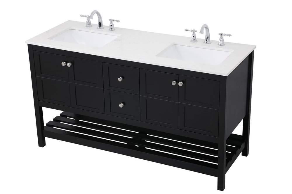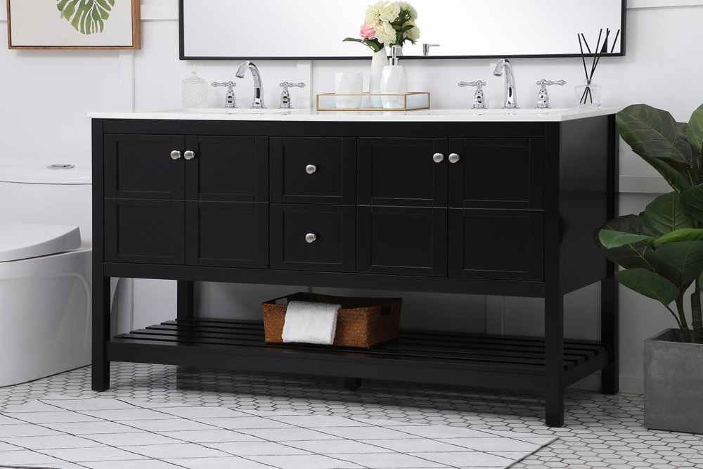 The subtle beauty of the Theo collection 60" vanity in a black finish exudes comfortable luxury. Its modern, yet traditional beauty will surely dress up your bathroom or powder room without any fuss. The white stone countertop and porcelain undermount sink shows quiet opulence, and the legs support upright without fail. Brushed Nickel hardware complements the trendy black finish, with pulls adorning the four cabinet doors and two drawers, showcasing ample storage space within. Slated shelf allows for additional space to organize your towels. Whether this vanity is in your bathroom or for guests, its presence will surely elevate the aesthetics of your room.