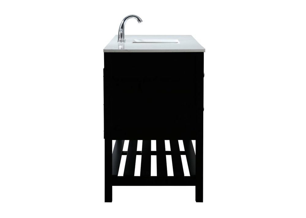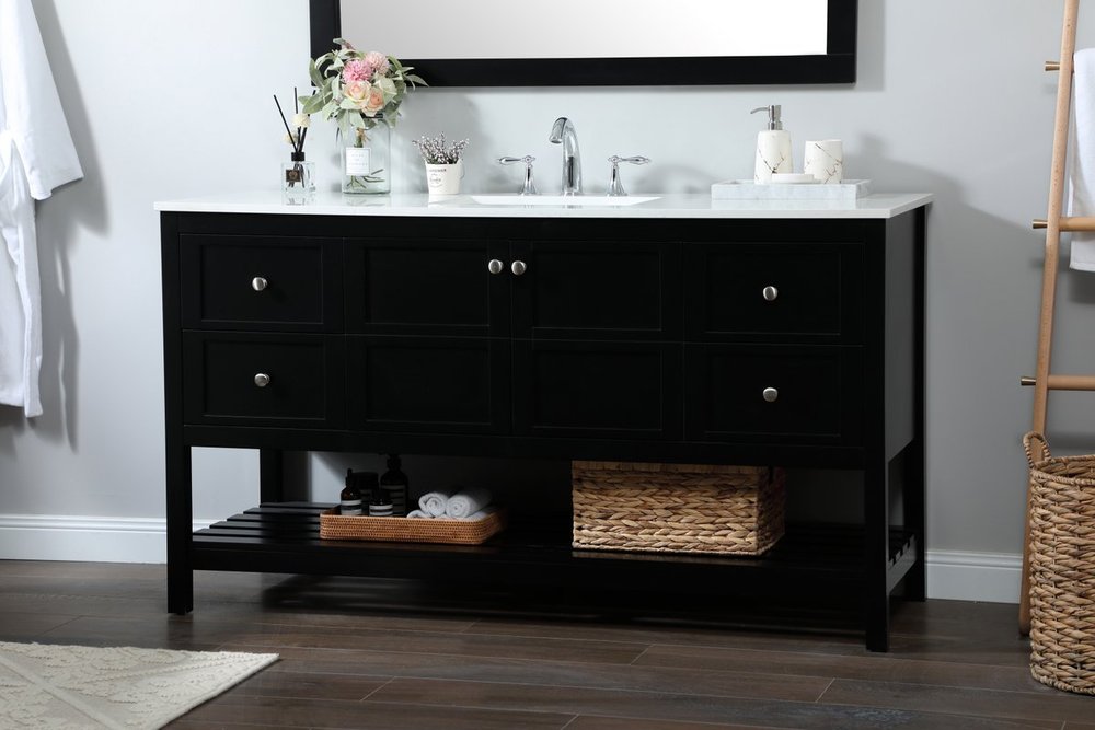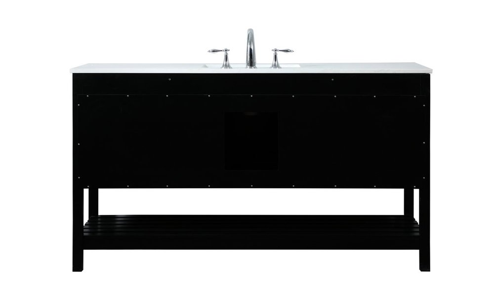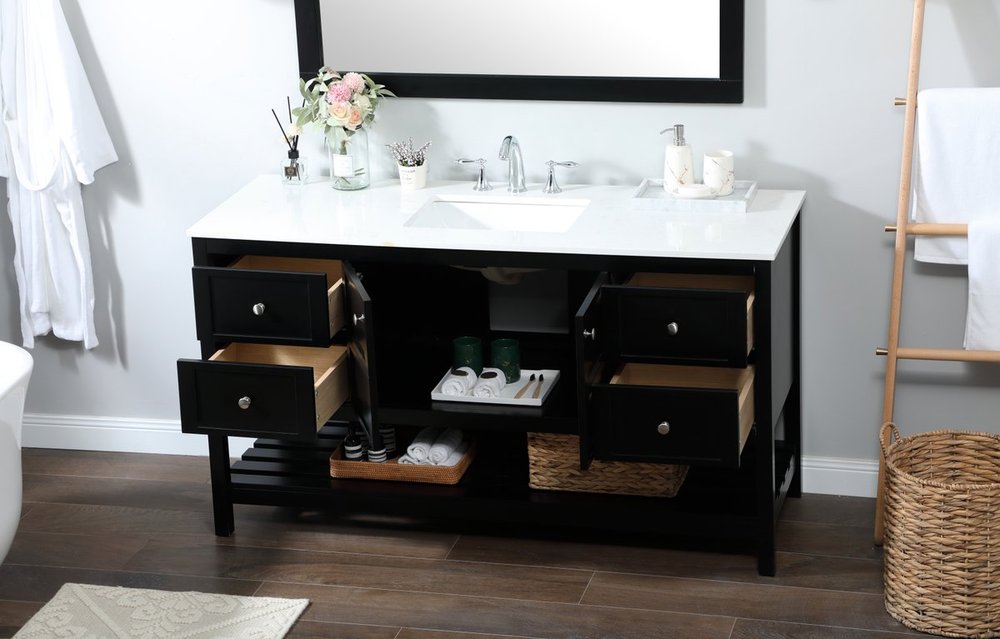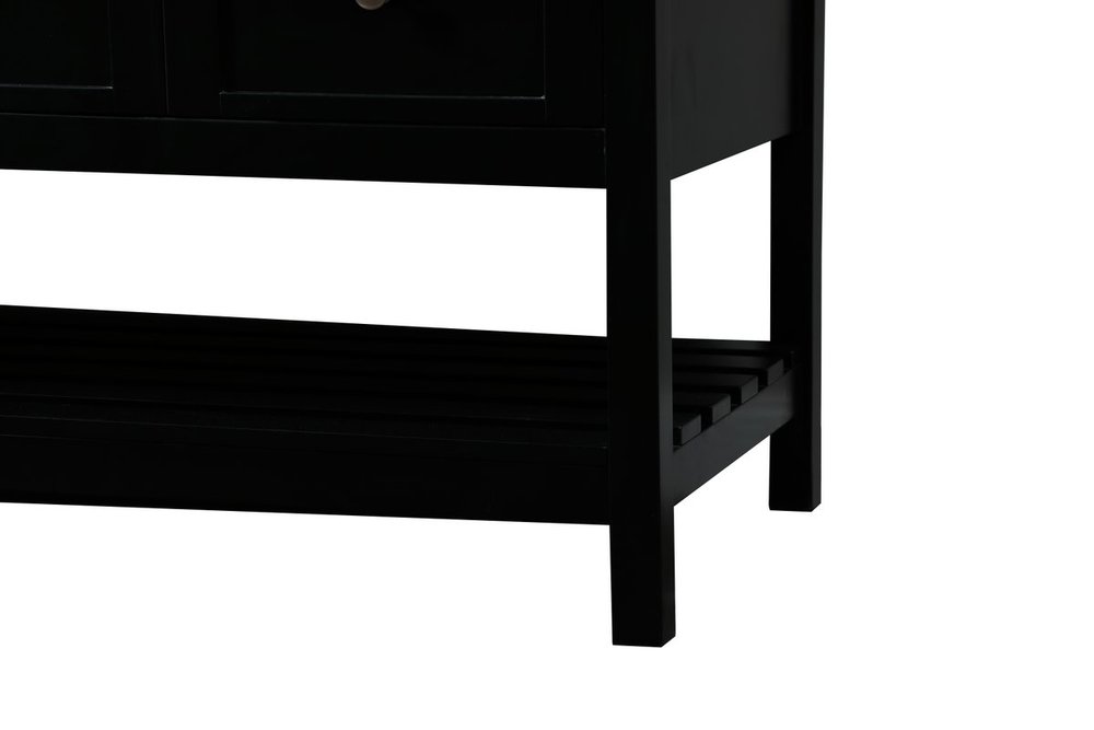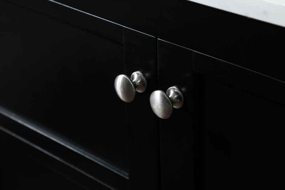 The subtle beauty of the Theo collection vanity exudes comfortable luxury. Its modern, yet traditional beauty will surely dress up your bathroom or powder room without any fuss. The calacatta engineered marble countertop and porcelain undermount sink shows quiet opulence, and the legs support upright without fail. Brushed nickel hardware complements the classic black finish, with pulls adorning the two cabinet doors, showcasing ample storage space within. Slated shelf allows for additional space to organize your towels. Whether this vanity is in your bathroom or for guests, its presence will surely elevate the aesthetics of your room.