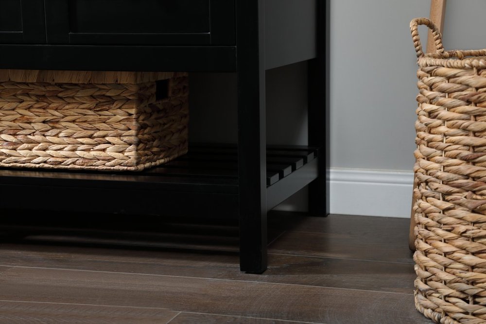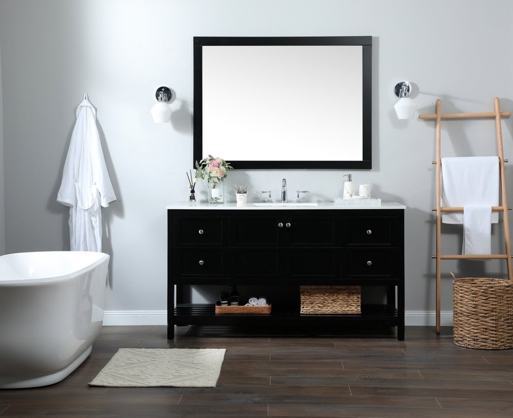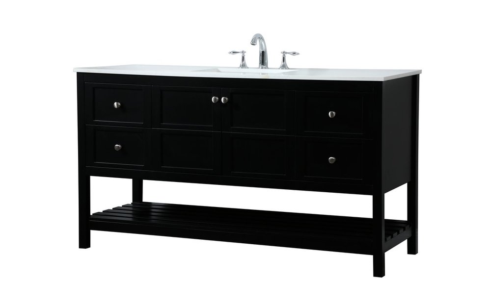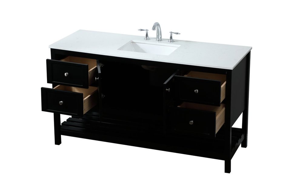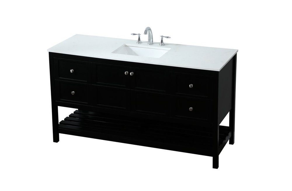 The subtle beauty of the Theo collection vanity exudes comfortable luxury. Its modern, yet traditional beauty will surely dress up your bathroom or powder room without any fuss. The calacatta engineered marble countertop and porcelain undermount sink shows quiet opulence, and the legs support upright without fail. Brushed nickel hardware complements the classic black finish, with pulls adorning the two cabinet doors, showcasing ample storage space within. Slated shelf allows for additional space to organize your towels. Whether this vanity is in your bathroom or for guests, its presence will surely elevate the aesthetics of your room.