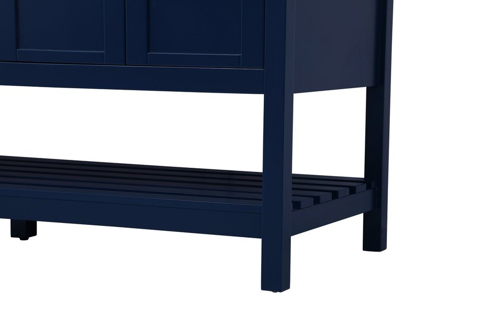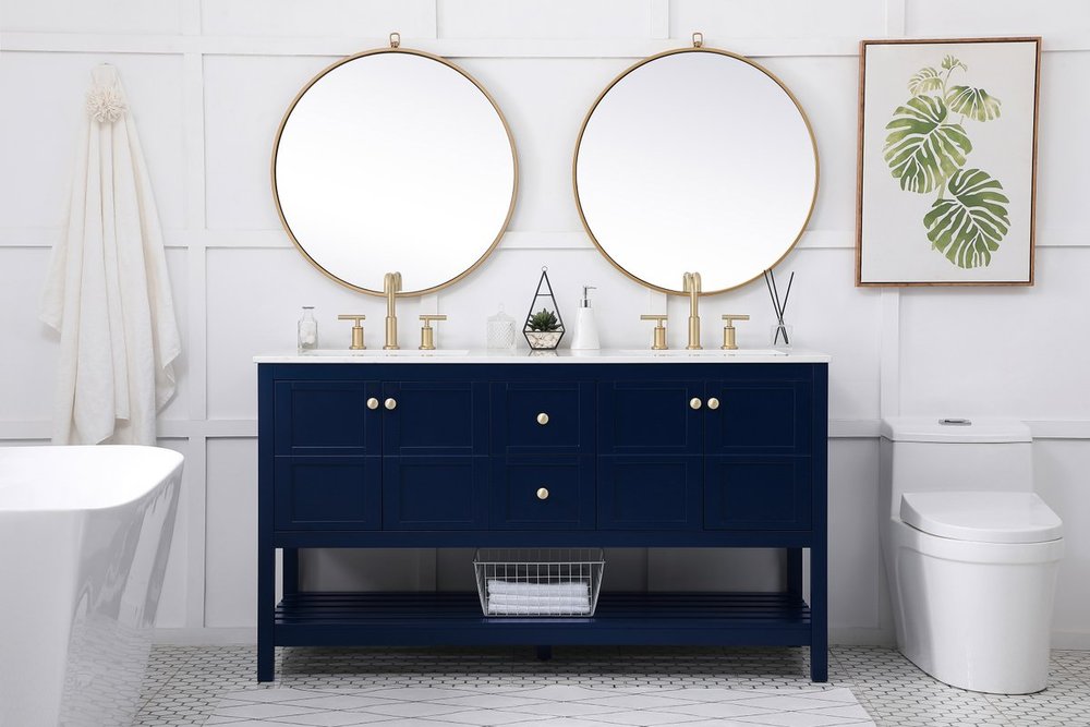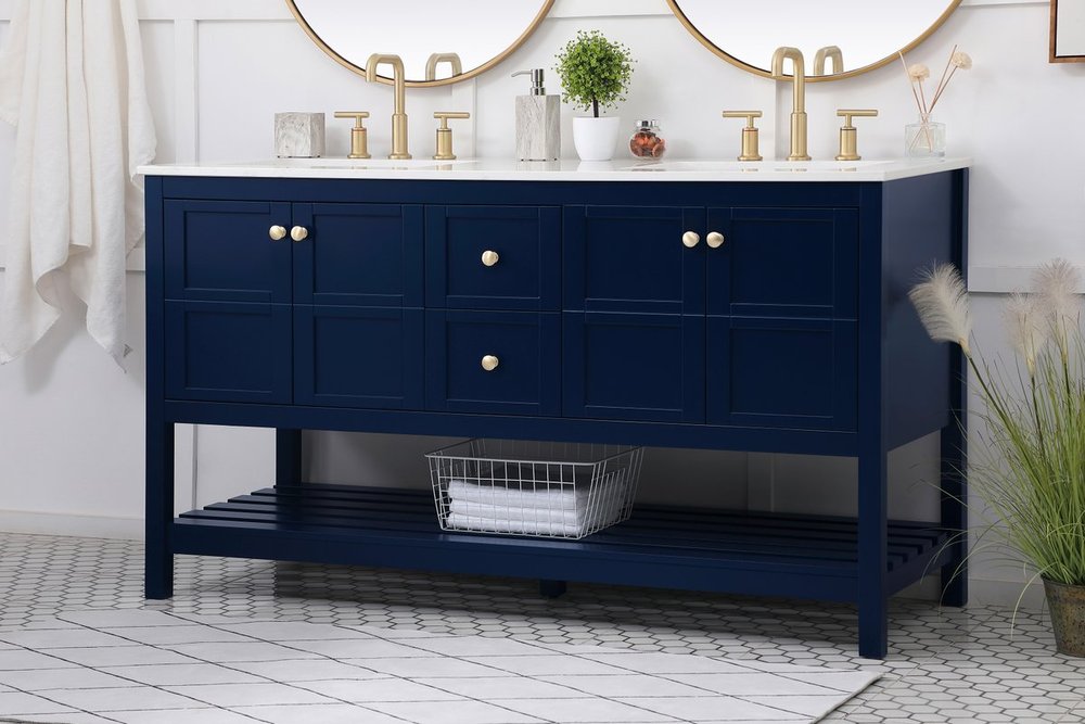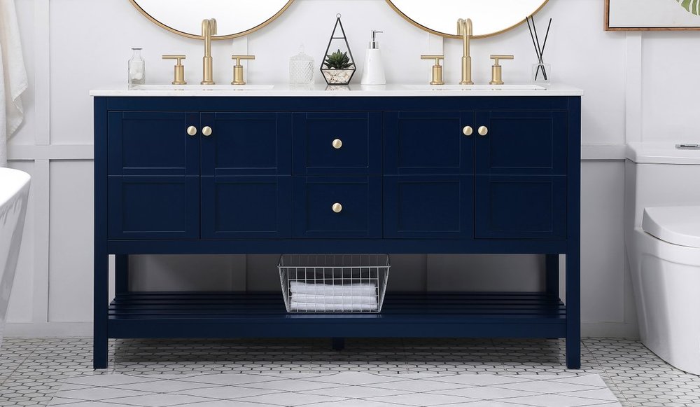The subtle beauty of the Theo collection 60" vanity in a blue finish exudes comfortable luxury. Its modern, yet traditional beauty will surely dress up your bathroom or powder room without any fuss. The white stone countertop and porcelain undermount sink shows quiet opulence, and the legs support upright without fail. Gold hardware complements the trendy blue finish, with pulls adorning the four cabinet doors and two drawers, showcasing ample storage space within. Slated shelf allows for additional space to organize your towels. Whether this vanity is in your bathroom or for guests, its presence will surely elevate the aesthetics of your room.