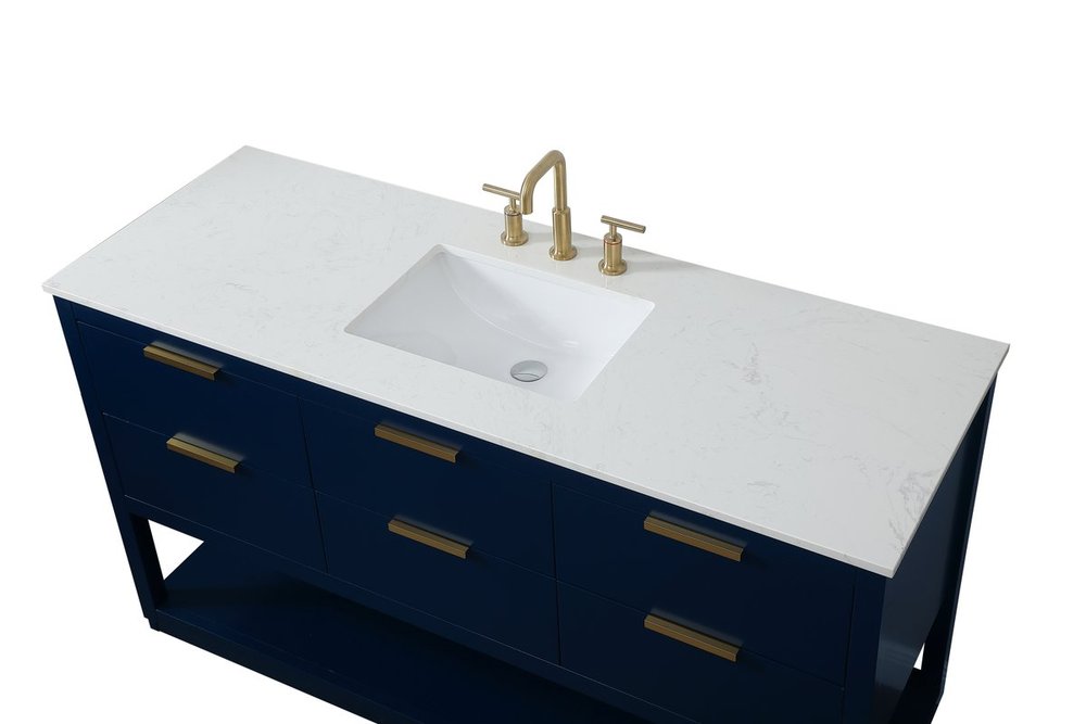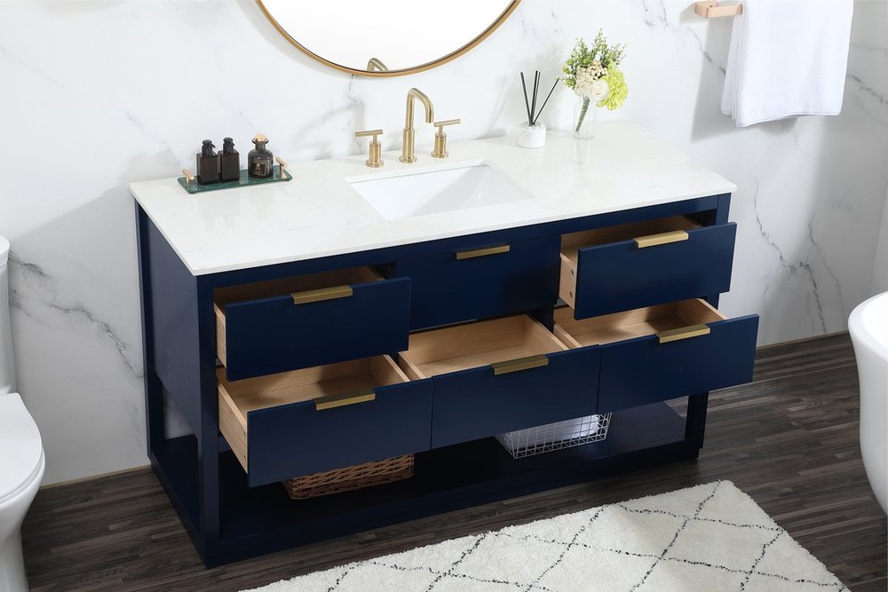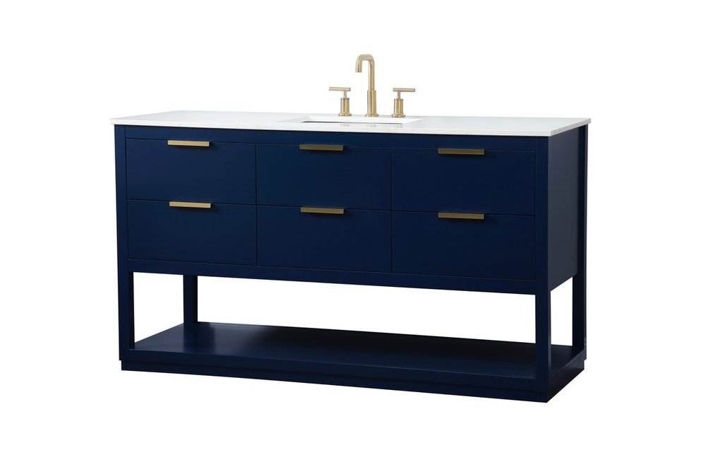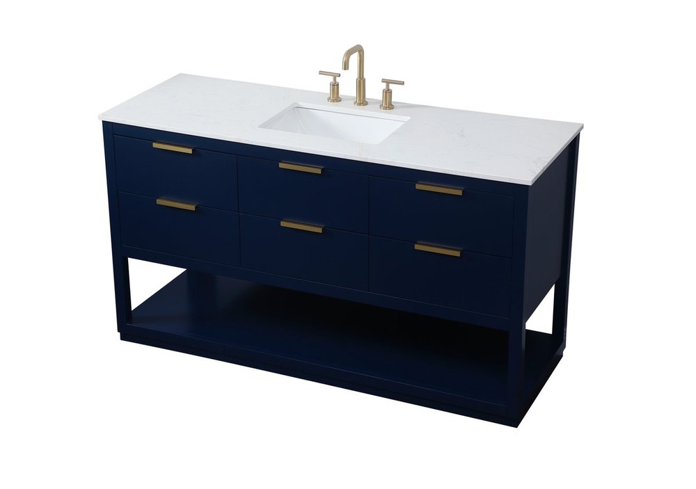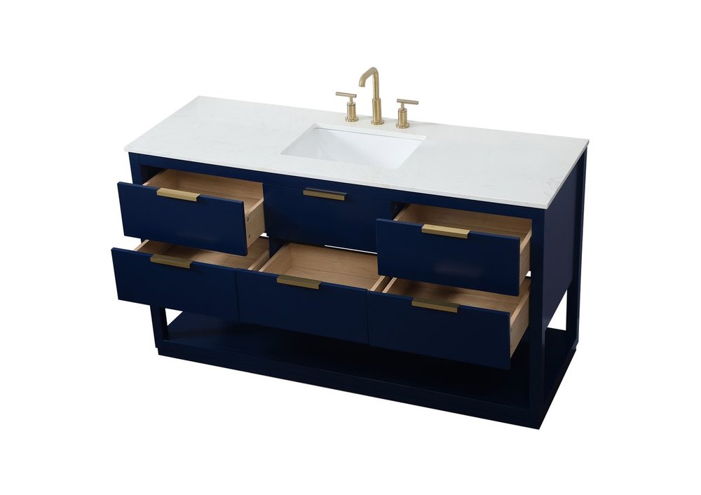 Live in modern comfort with this 60" blue finish vanity. Dressed in a blue and sleek gold metal hardware, its contemporary style will have your bathroom or powder room elevated in modern sophistication. The open shelf at the base and five drawers reveal ample storage space for your bathroom essentials and miscellany. Clean lines create its own visual interest, adding trendy looks to your already chic room.