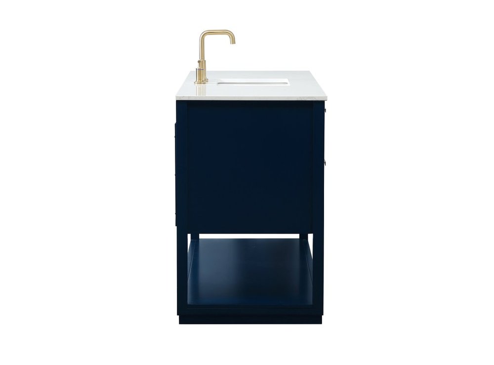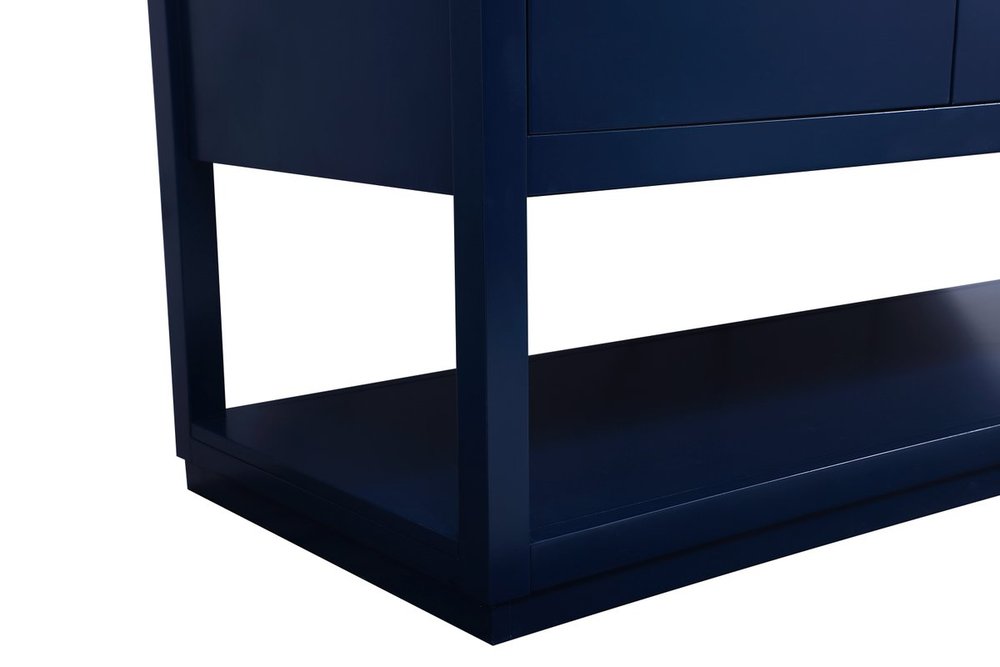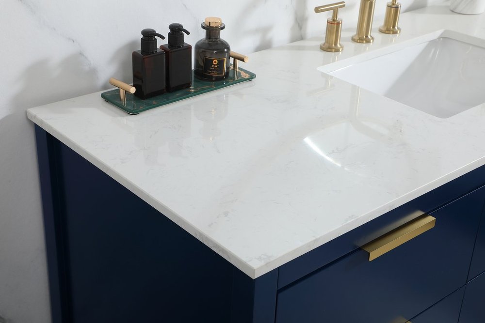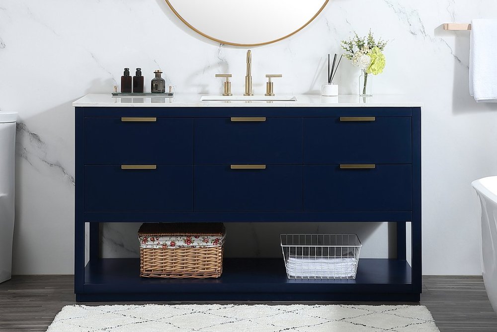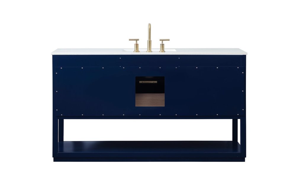 Live in modern comfort with this 60" blue finish vanity. Dressed in a blue and sleek gold metal hardware, its contemporary style will have your bathroom or powder room elevated in modern sophistication. The open shelf at the base and five drawers reveal ample storage space for your bathroom essentials and miscellany. Clean lines create its own visual interest, adding trendy looks to your already chic room.