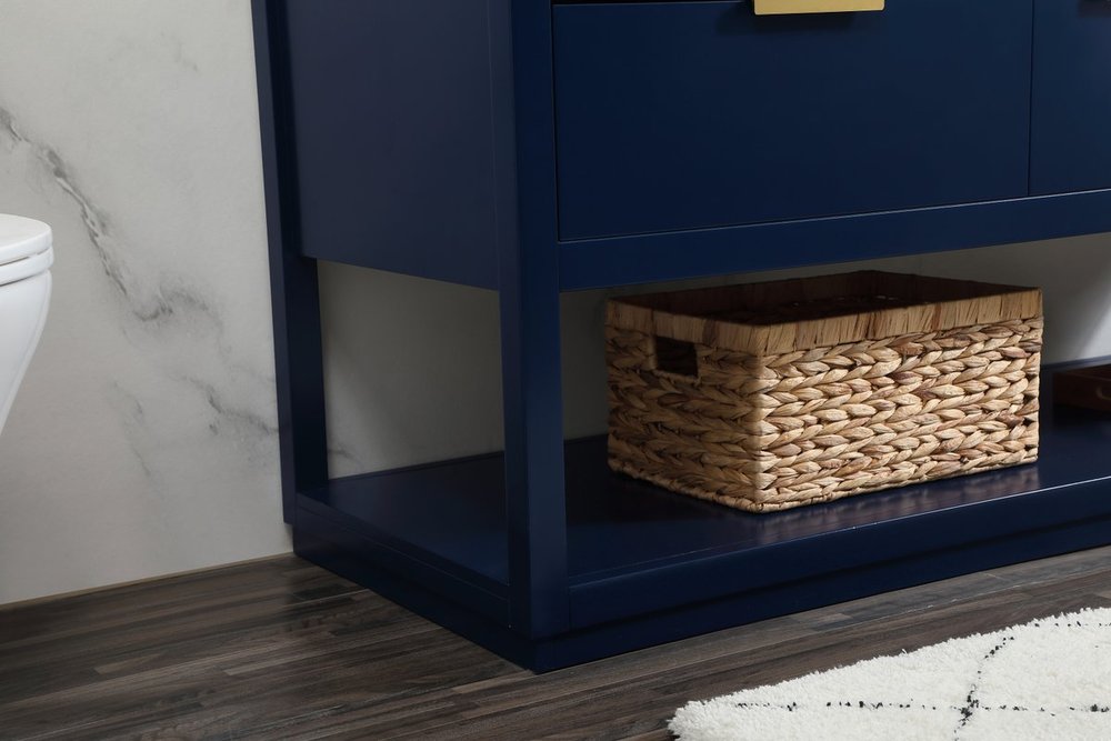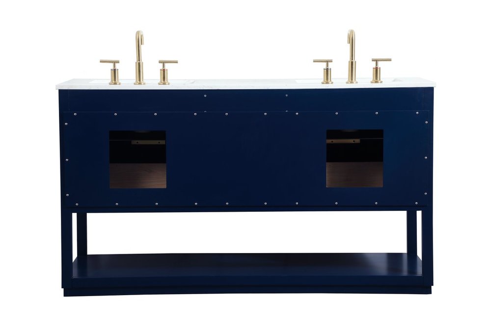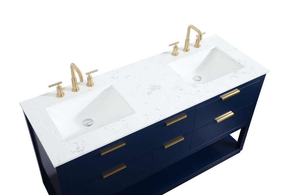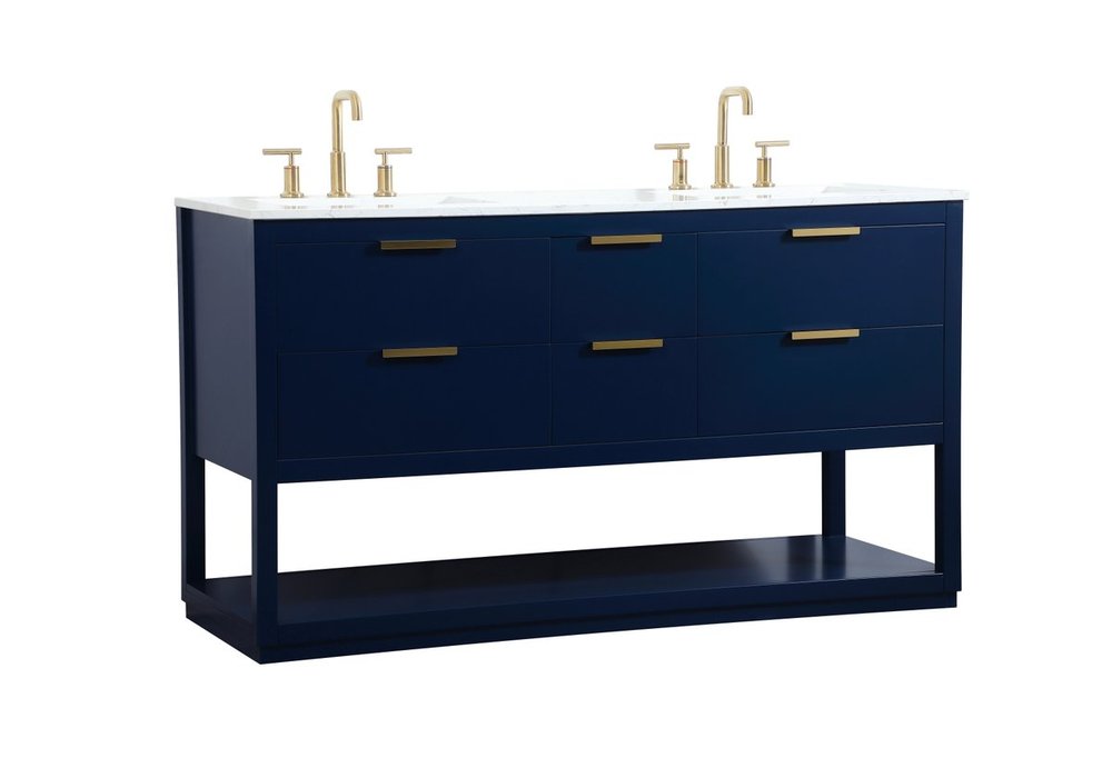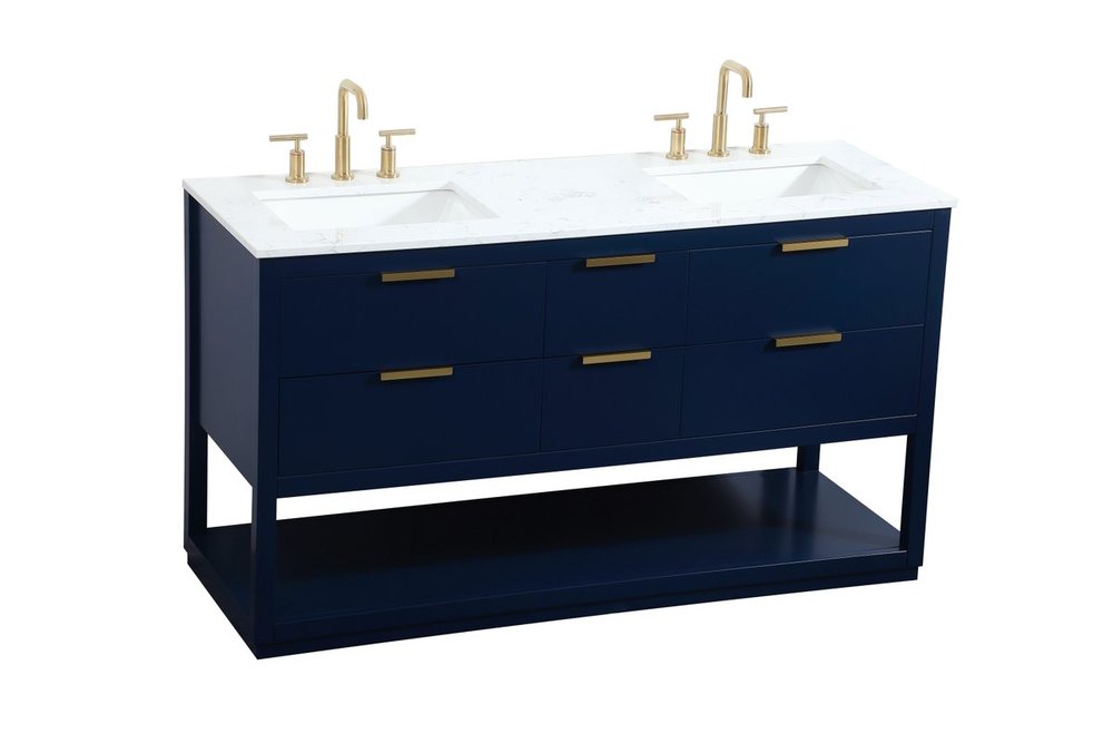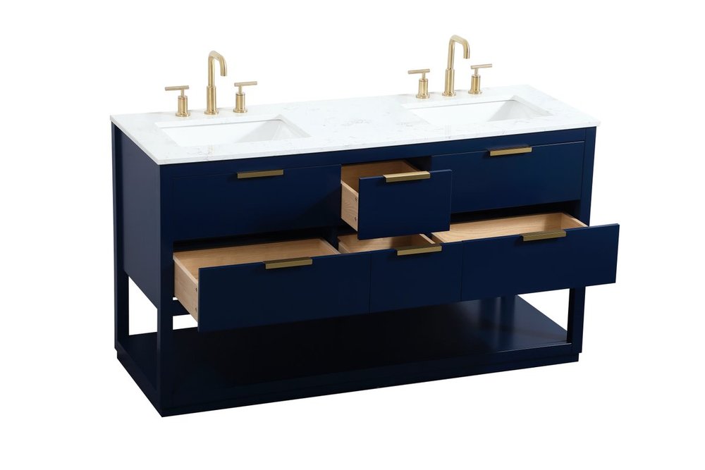 Live in modern comfort with this 60" blue finish double vanity. Dressed in a blue and sleek gold metal hardware, its contemporary style will have your bathroom or powder room elevated in modern sophistication. The open shelf at the base and five drawers reveal ample storage space for your bathroom essentials and miscellany. Clean lines create its own visual interest, adding trendy looks to your already chic room.
