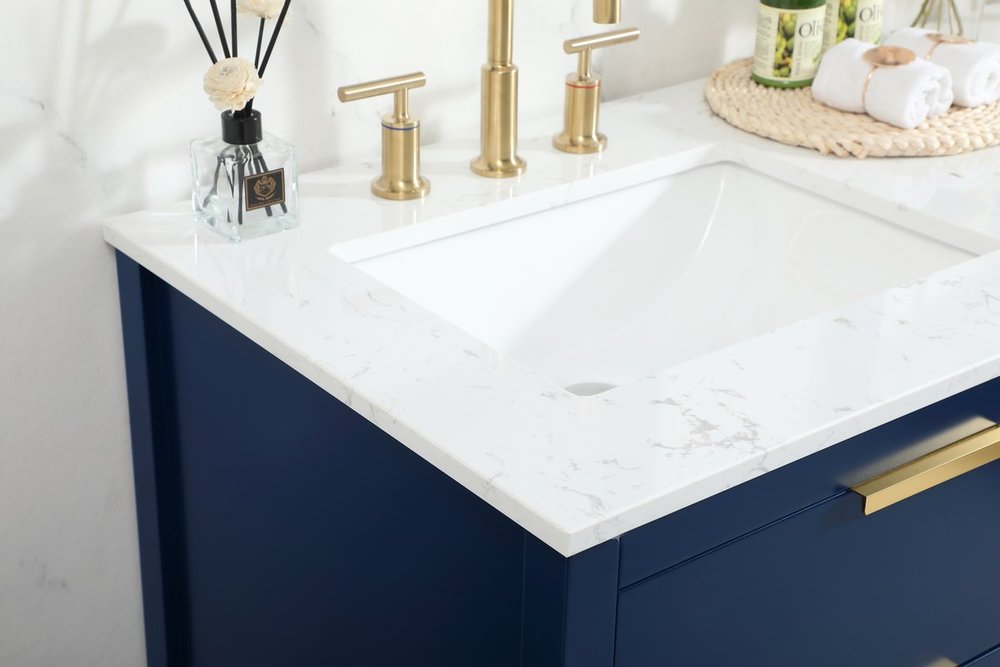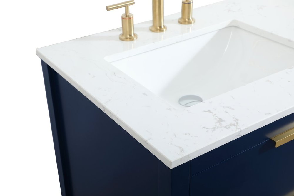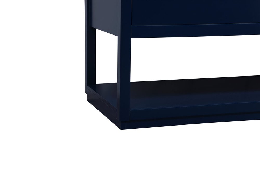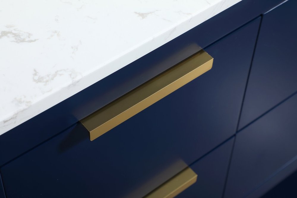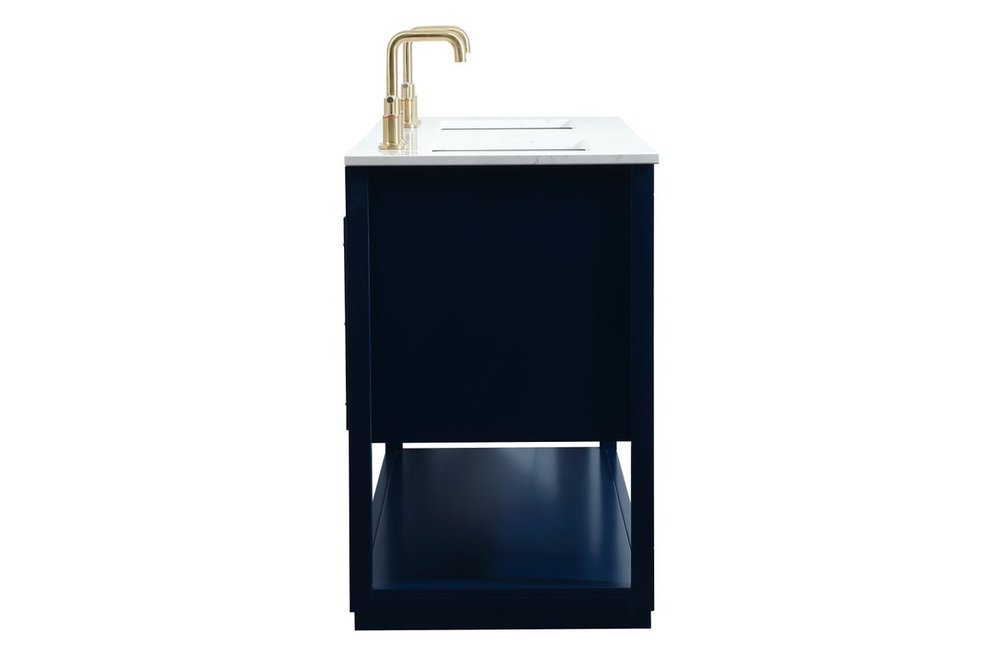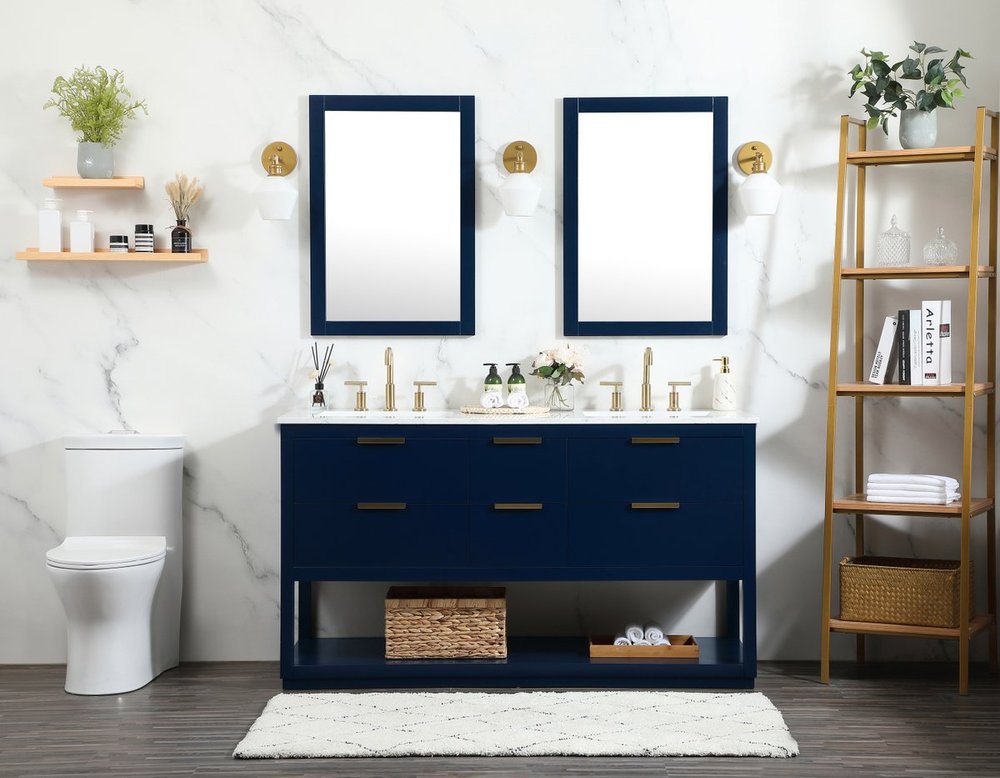 Live in modern comfort with this 60" blue finish double vanity. Dressed in a blue and sleek gold metal hardware, its contemporary style will have your bathroom or powder room elevated in modern sophistication. The open shelf at the base and five drawers reveal ample storage space for your bathroom essentials and miscellany. Clean lines create its own visual interest, adding trendy looks to your already chic room.