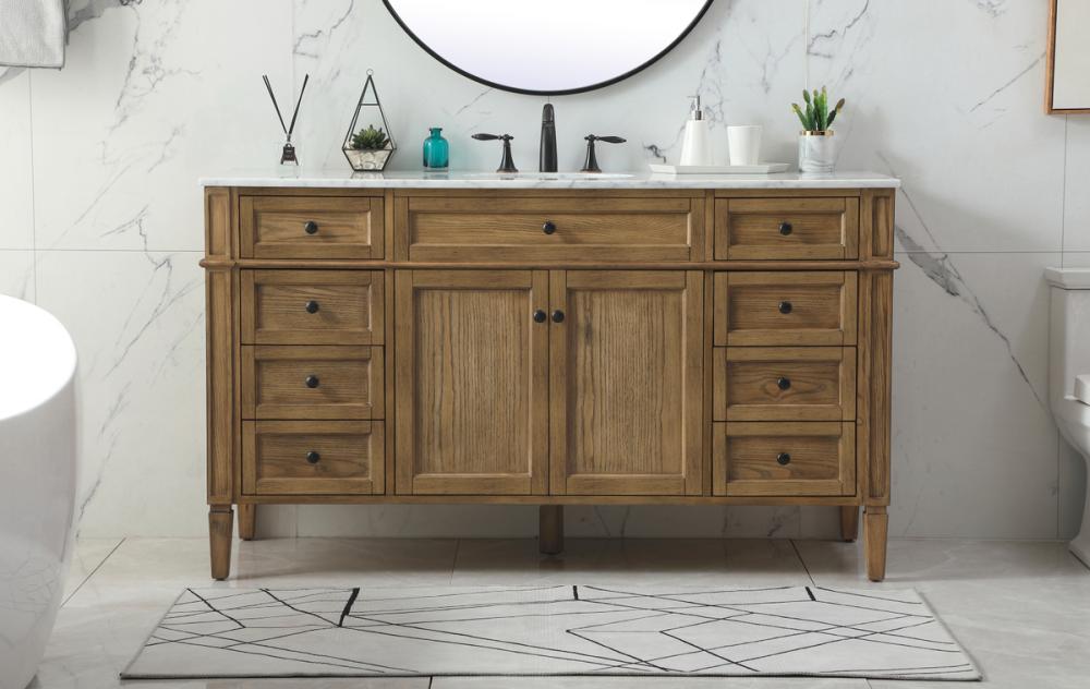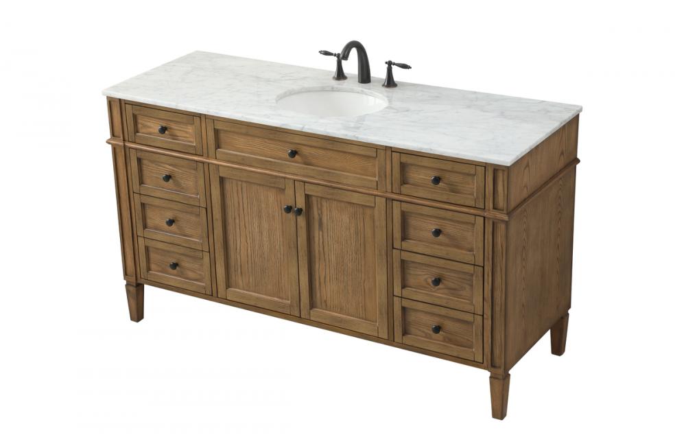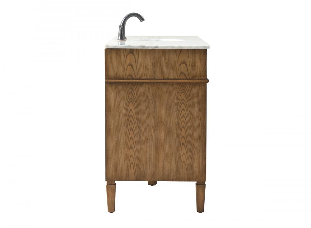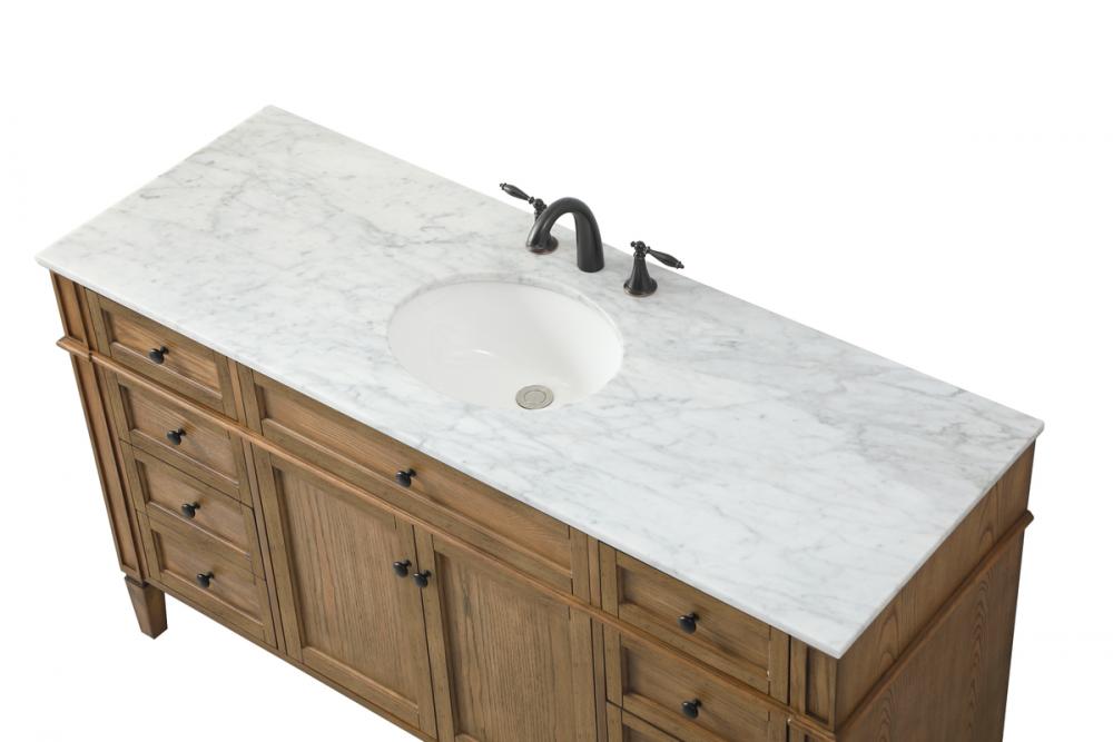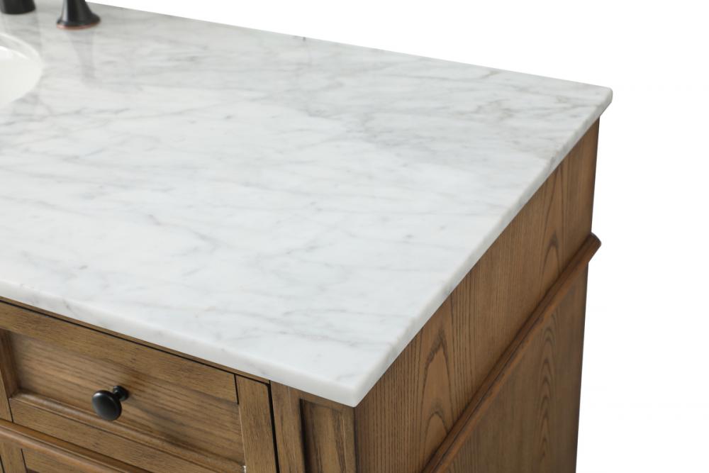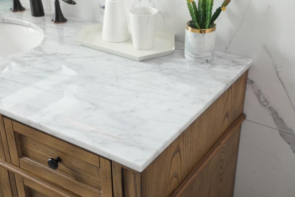 Comes with an undermount porcelain sink and a carrara white marble countertop