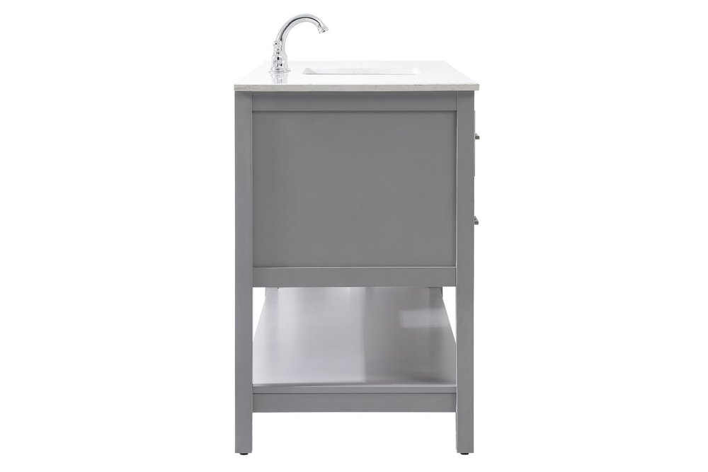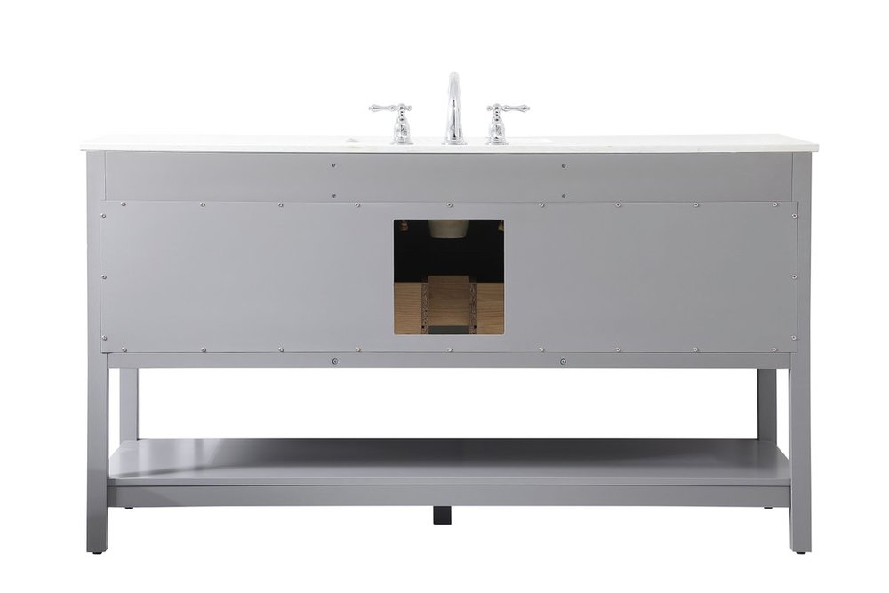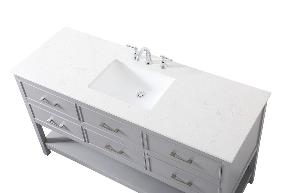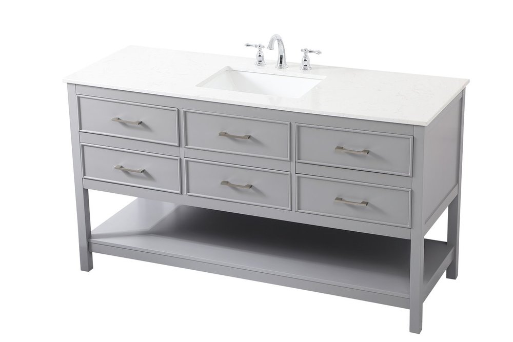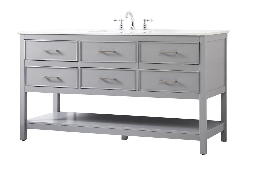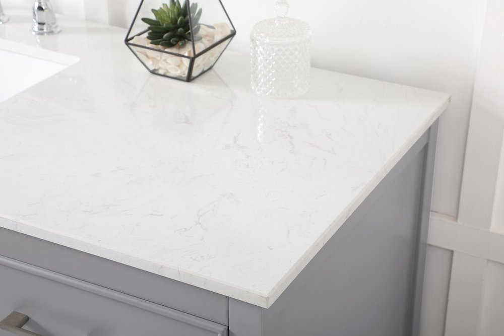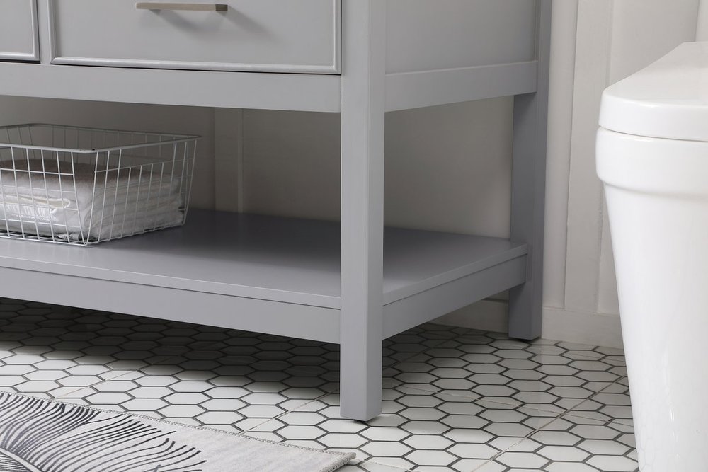 Make the most of your space with this traditional style bathroom vanity. Complements well with many aesthetics with its beautiful finish, calacatta engineered marble countertop, and the contemporary slender handle bar that sits on six functional drawers with soft closing mechanism, allowing you to store an assortment of bathroom essentials. The lower shelf makes it the perfect space to hold new towels for your guests. This compact vanity ensures both form and function in your bathroom or powder room for you and your guests.